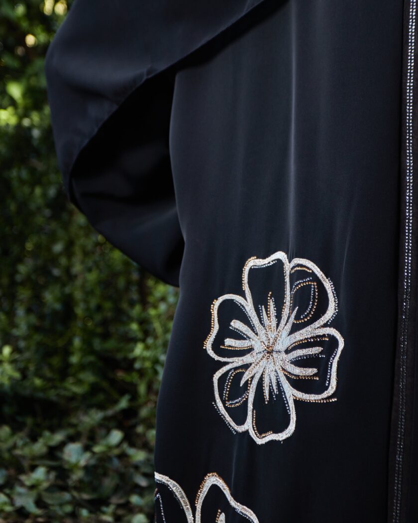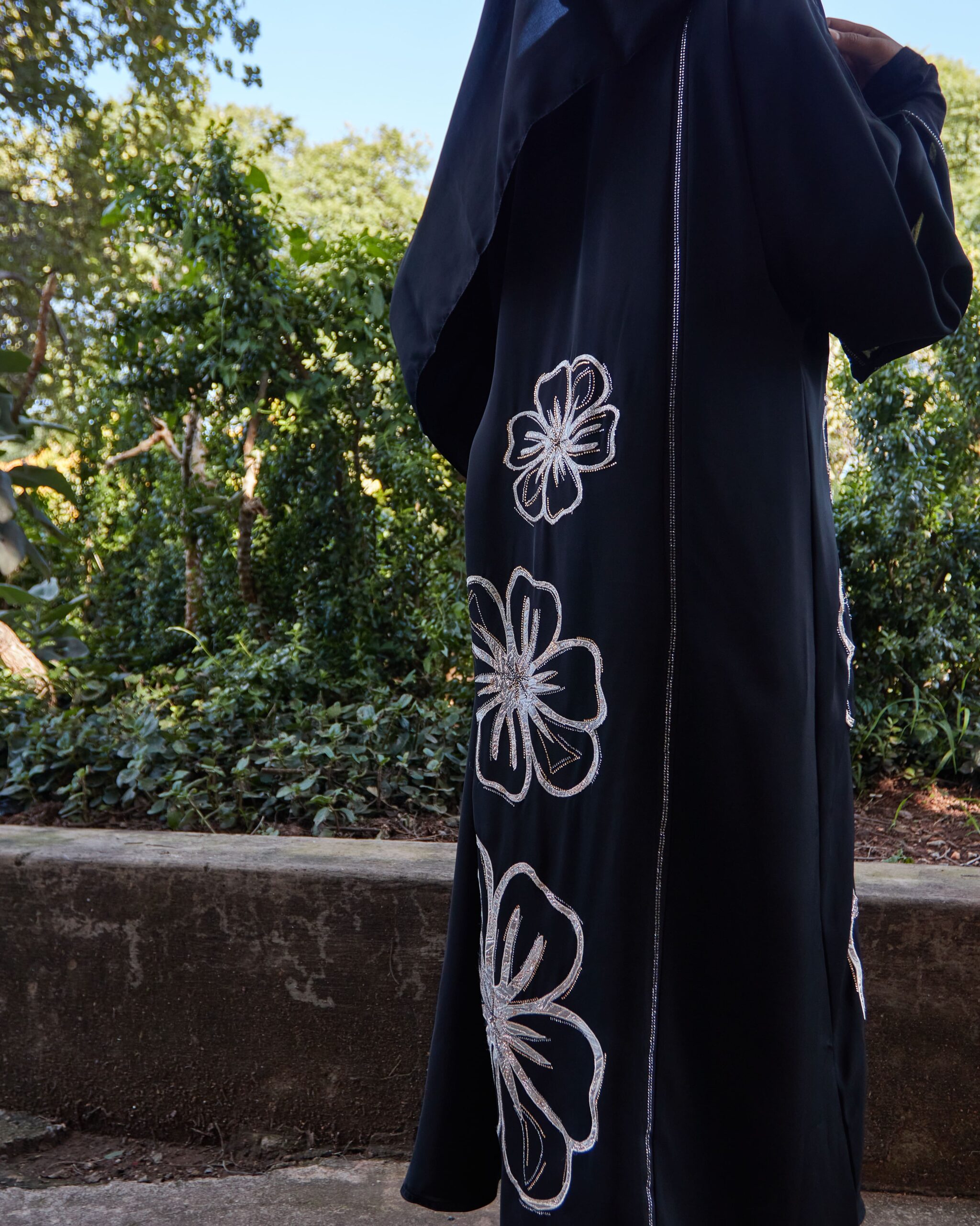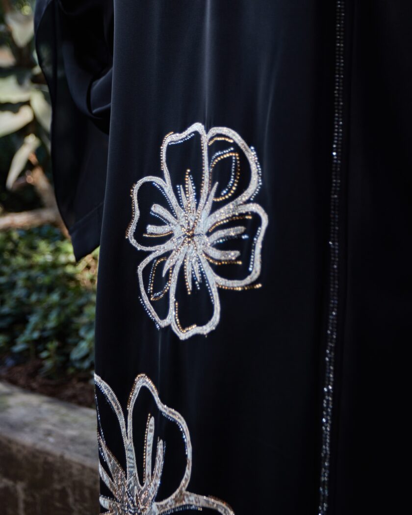 Nida Blossom Abaya boasting large embroidered flowers, each embellished with golden Korean crystals