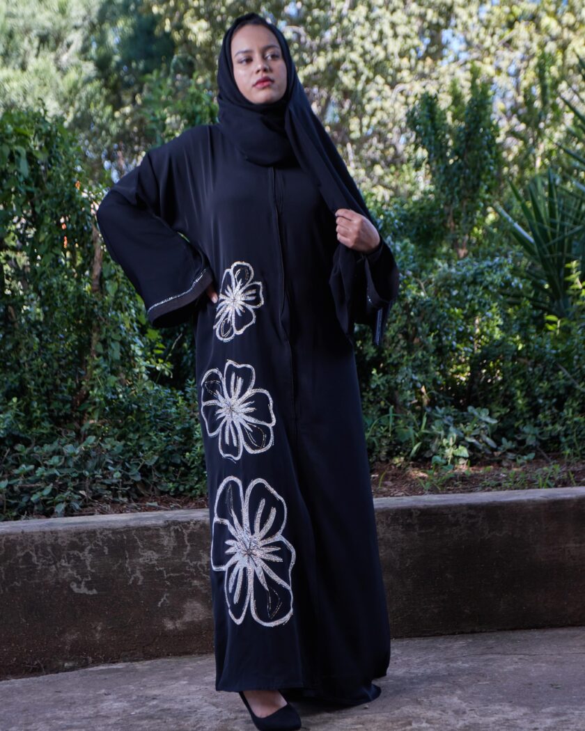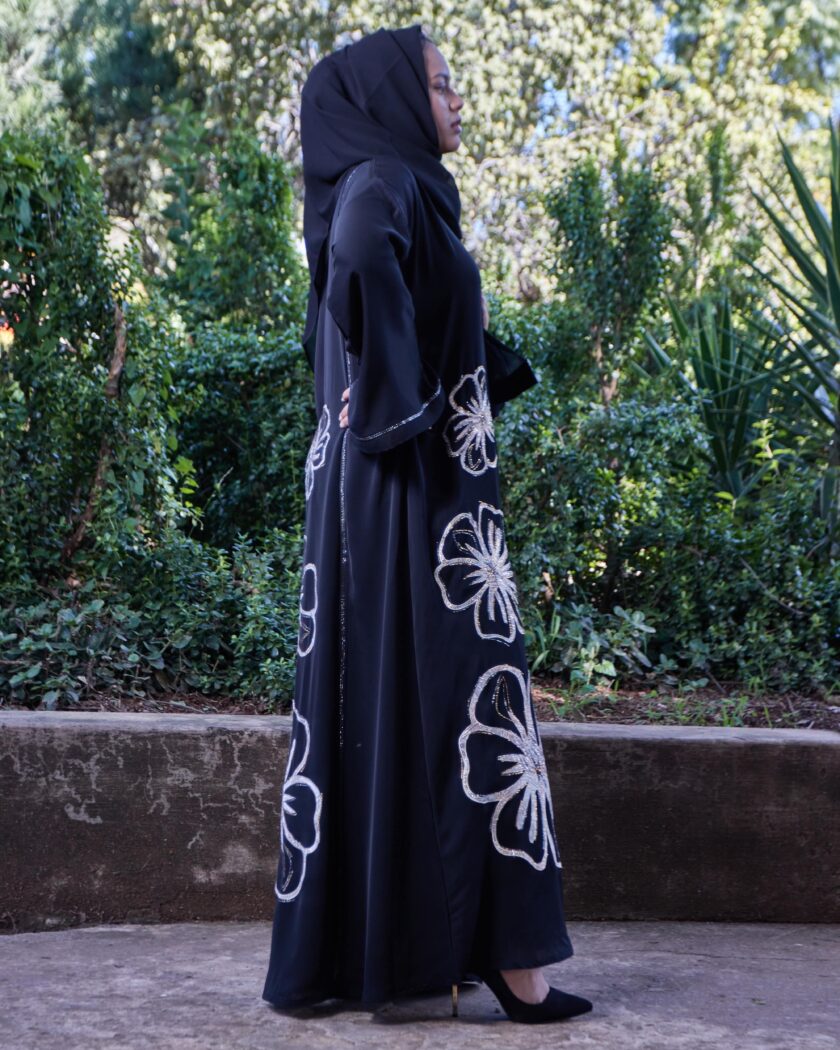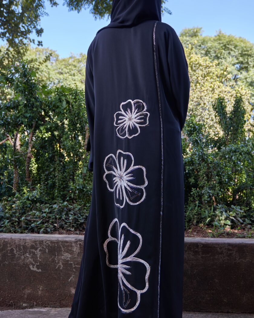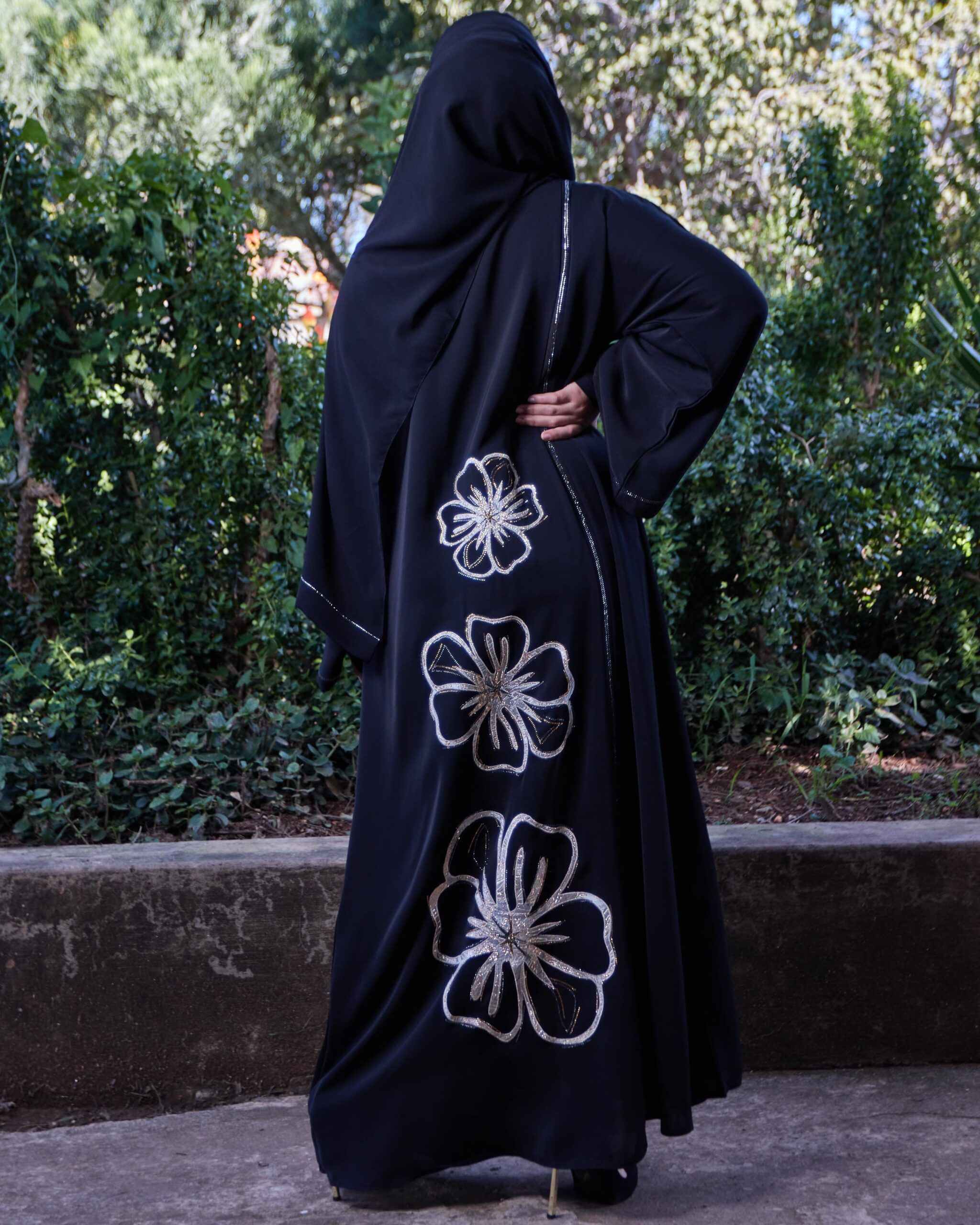 Nida Blossom Abaya boasting large embroidered flowers, each embellished with golden Korean crystals