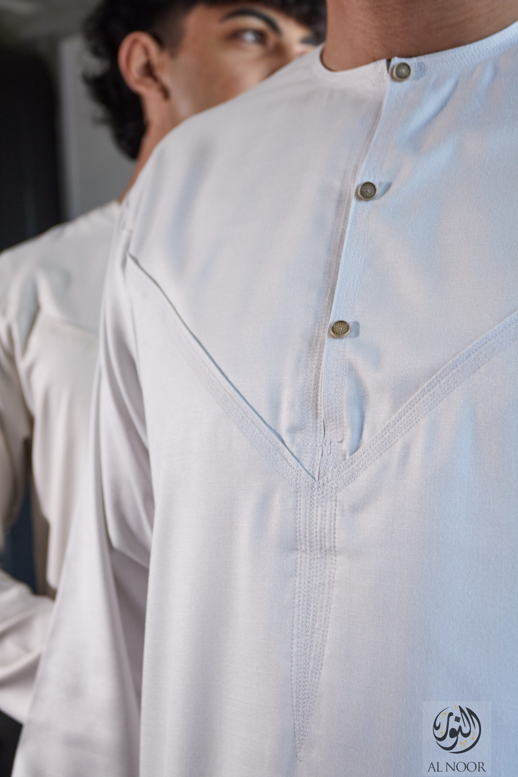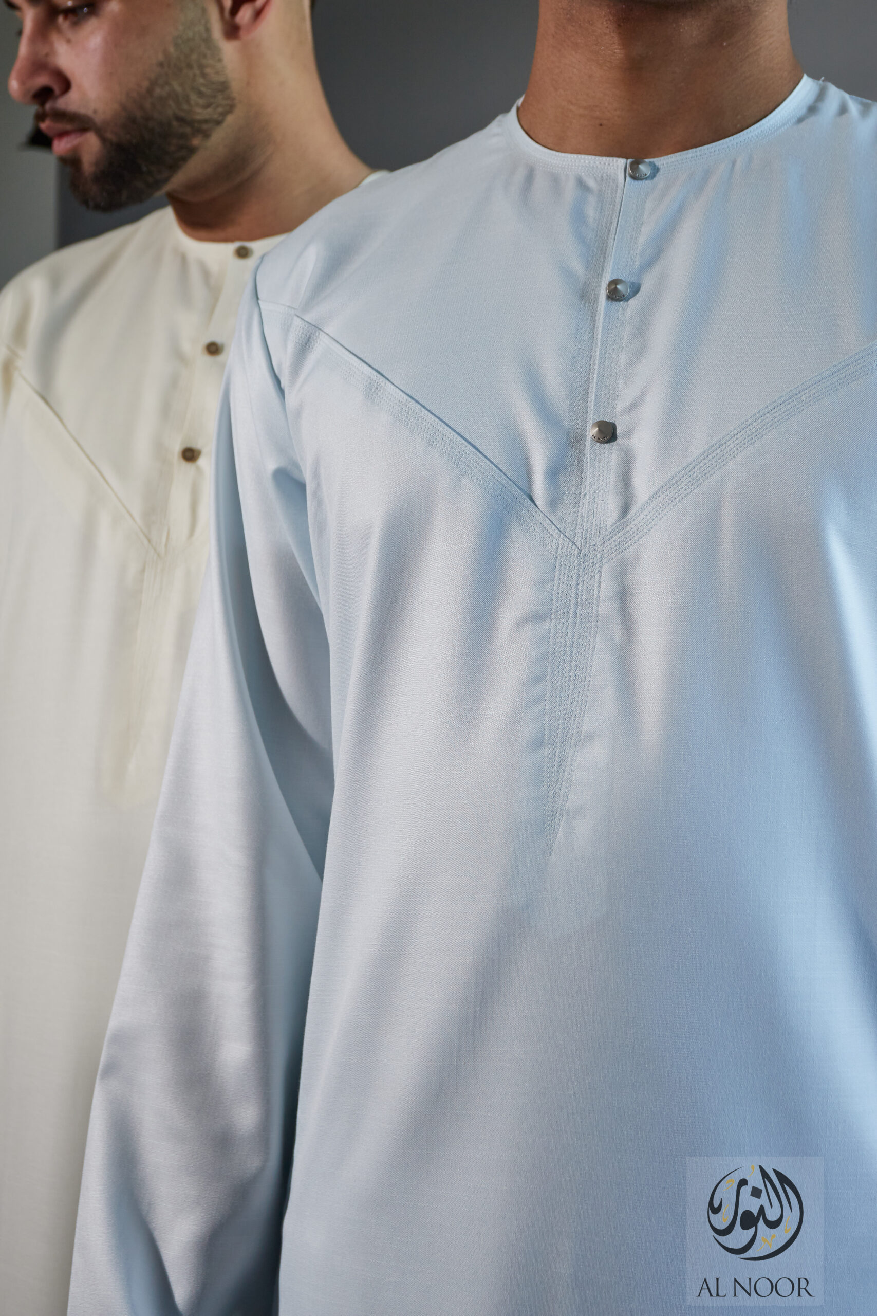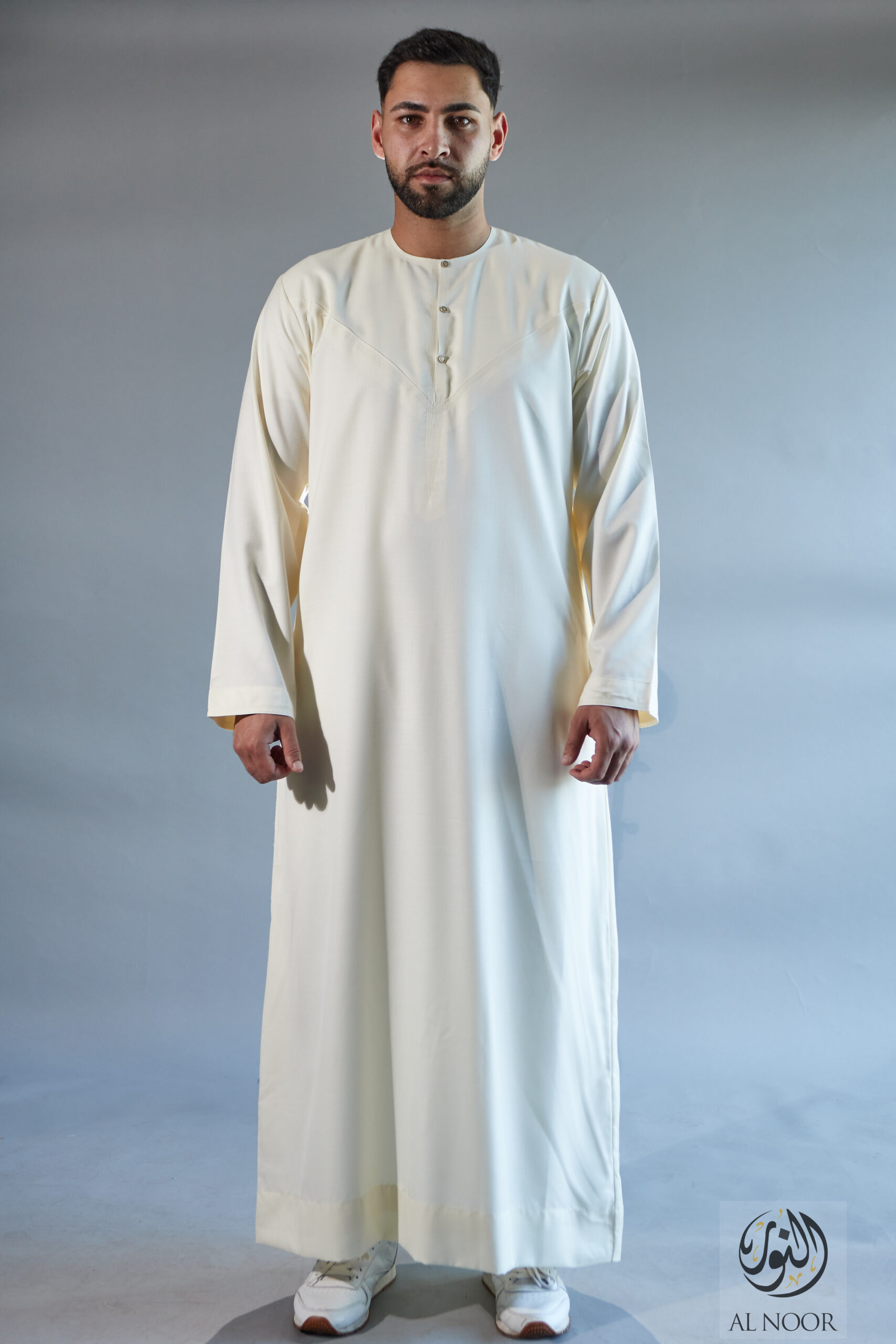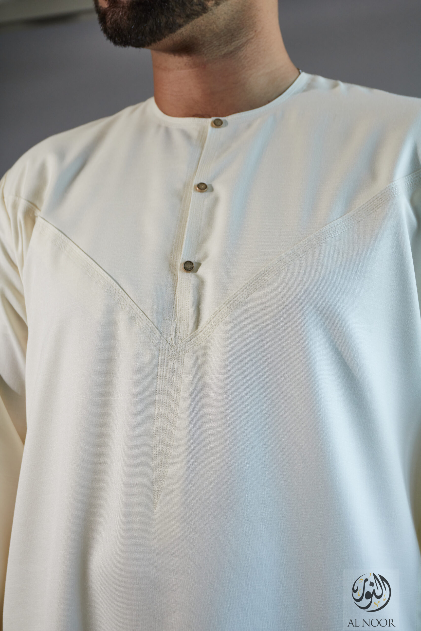 Al Noor Luxuriously soft Summer Linen Emirati collarless thobe featuring signature metal buttons