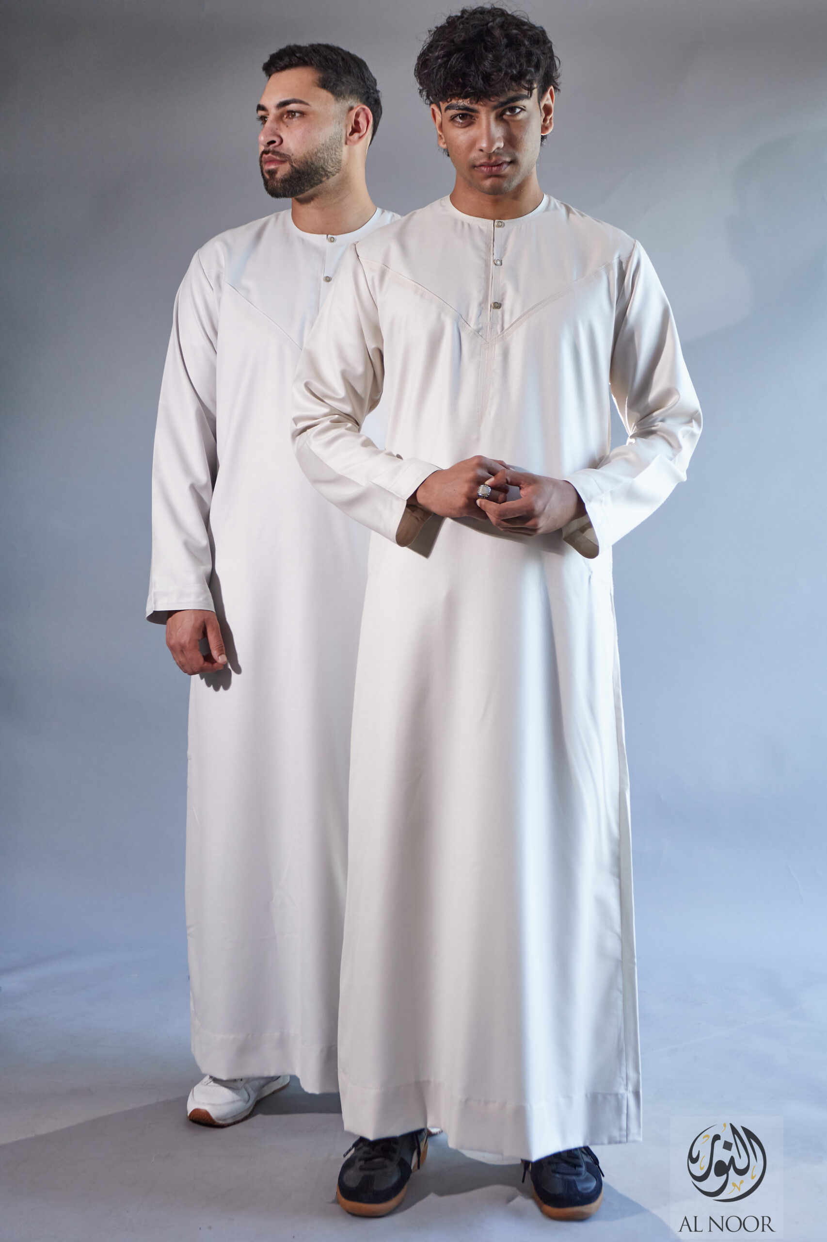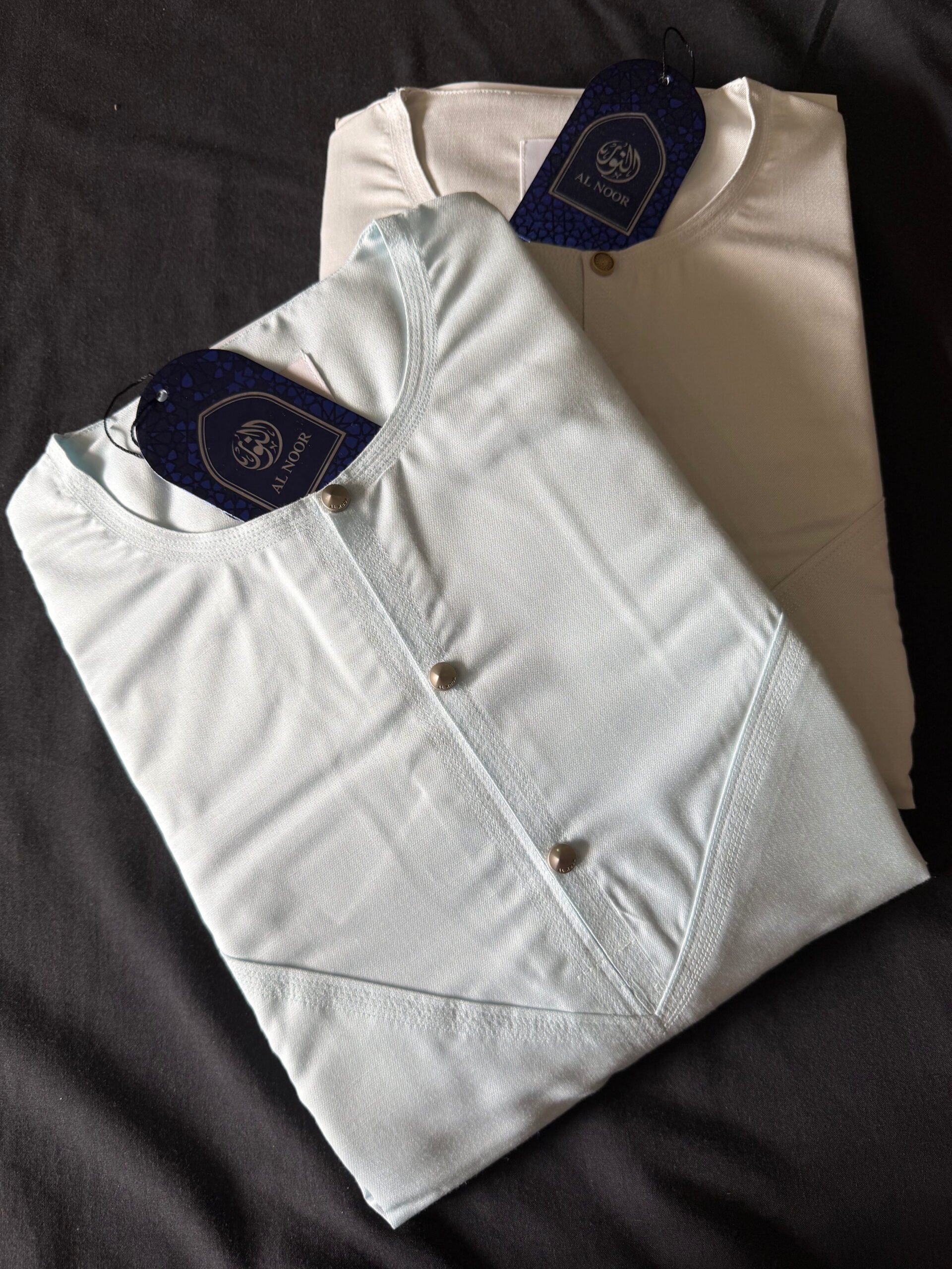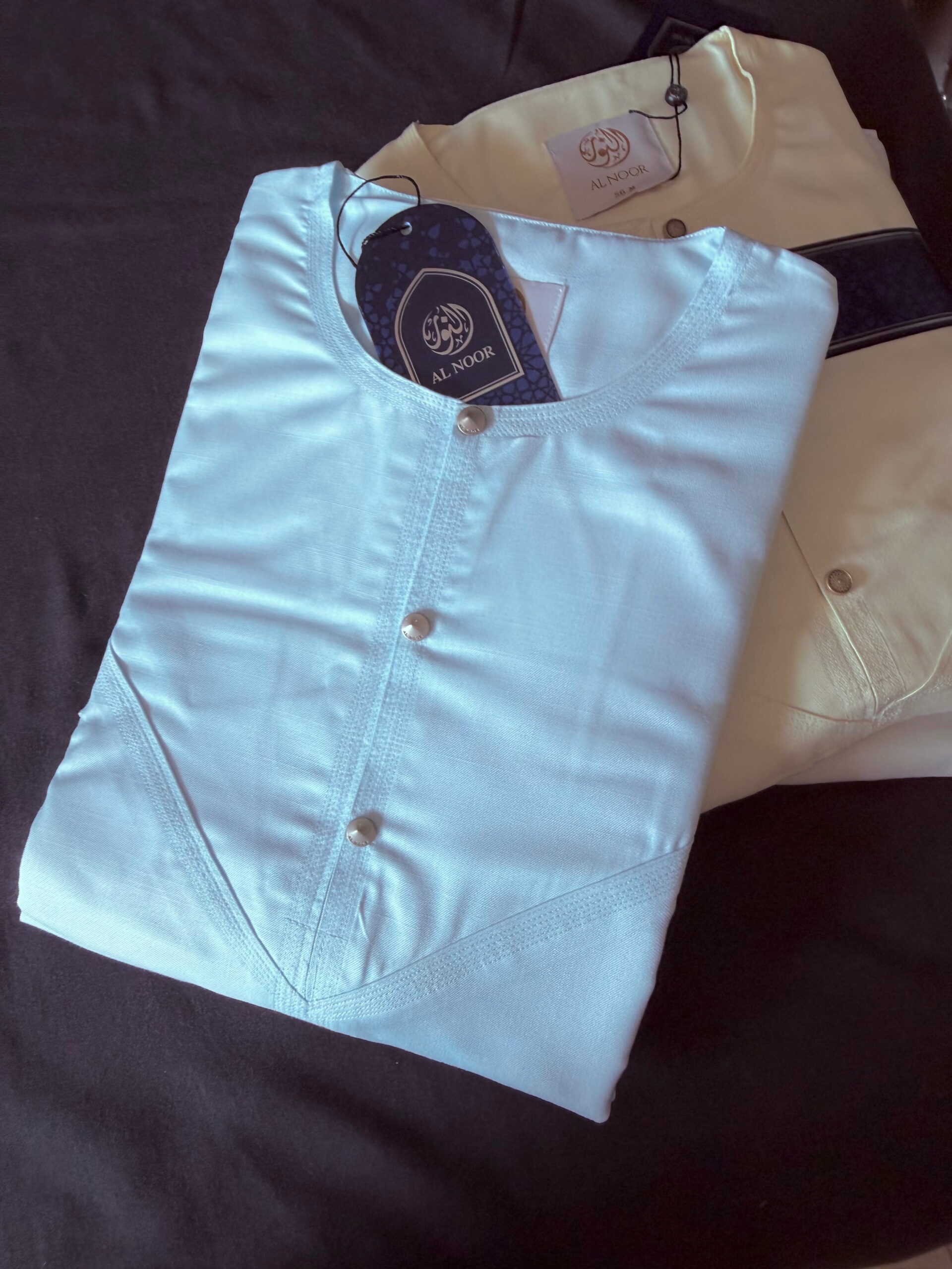Al Noor Luxuriously soft Summer Linen Emirati collarless thobe featuring signature metal buttons