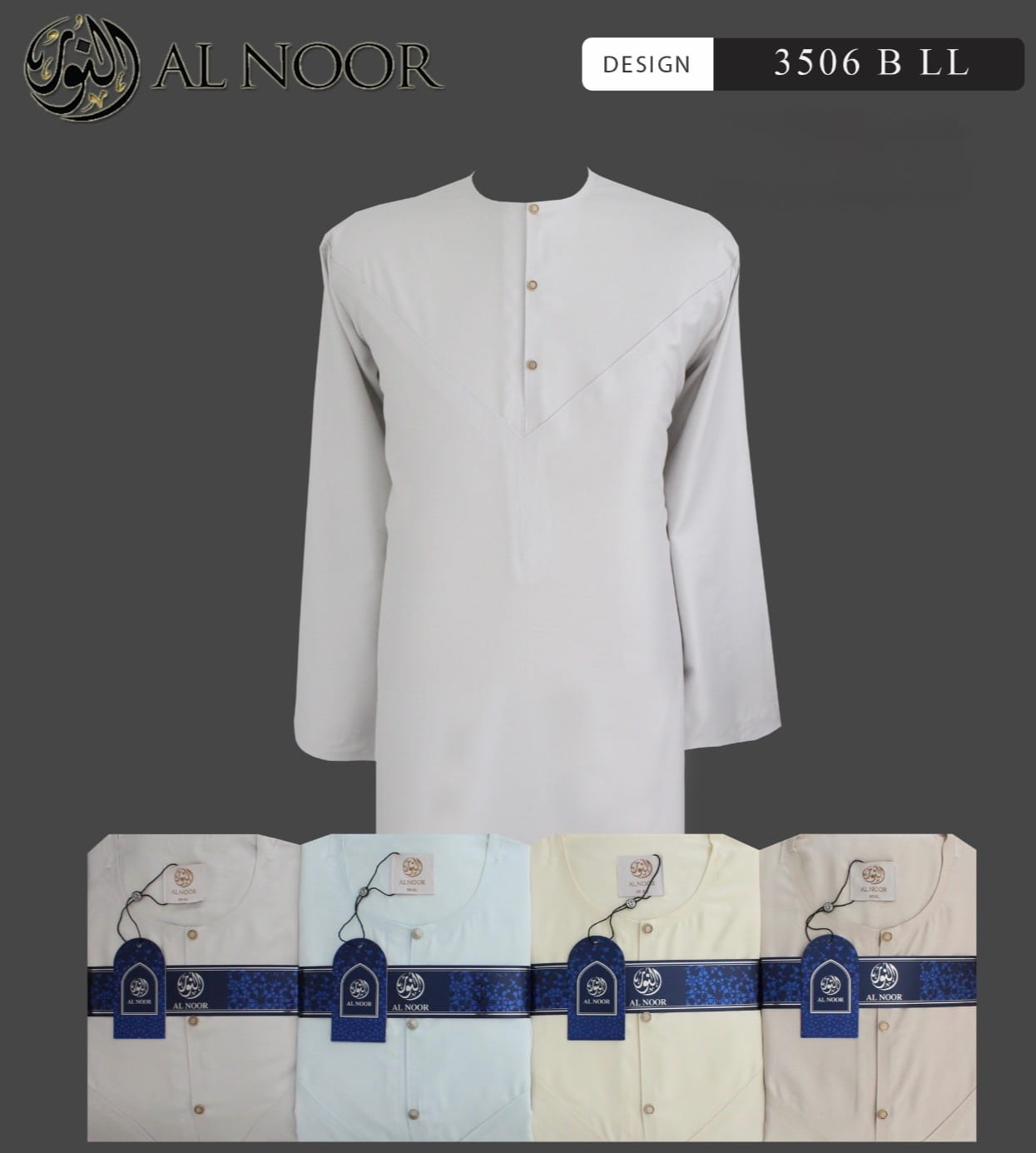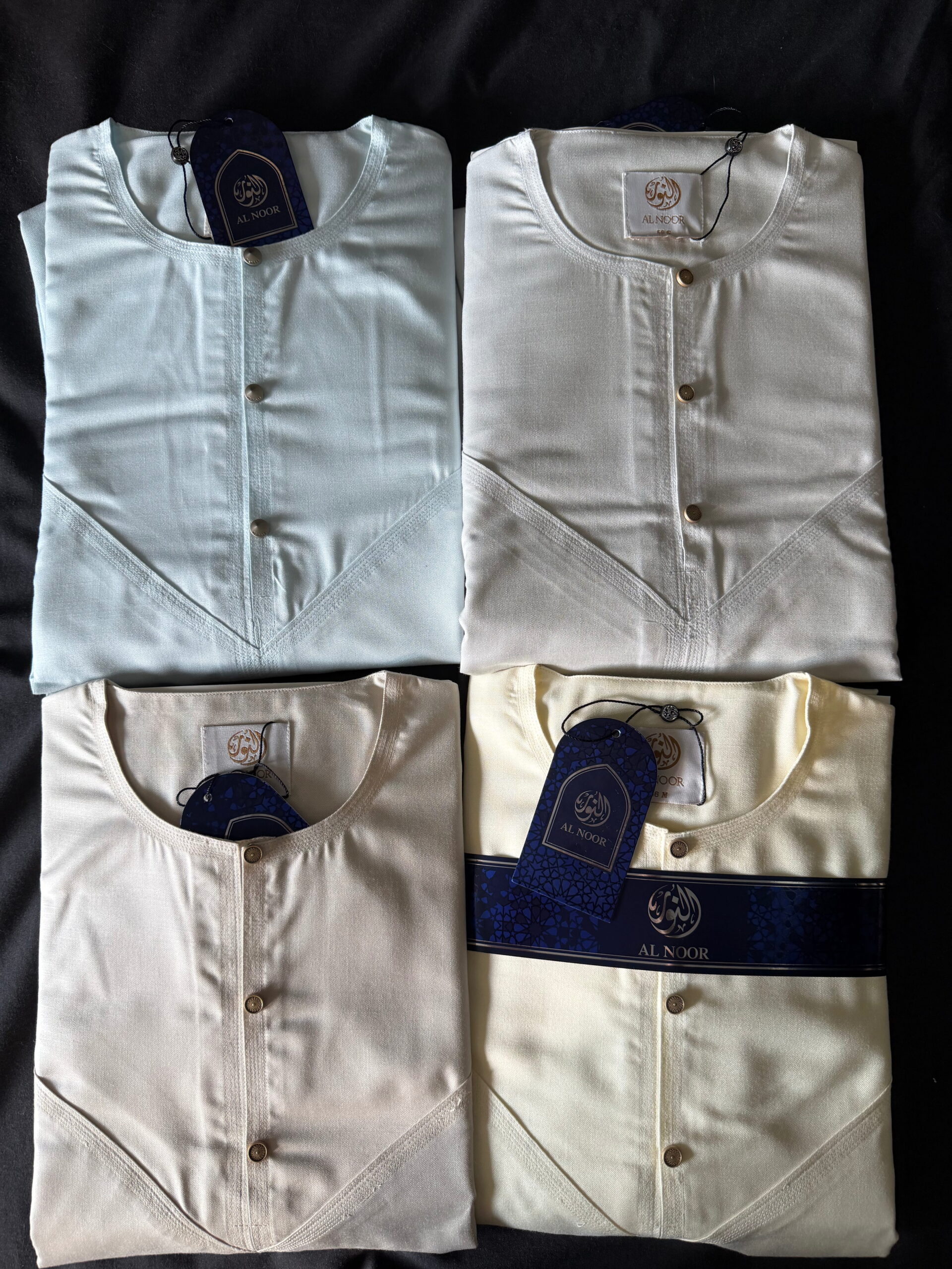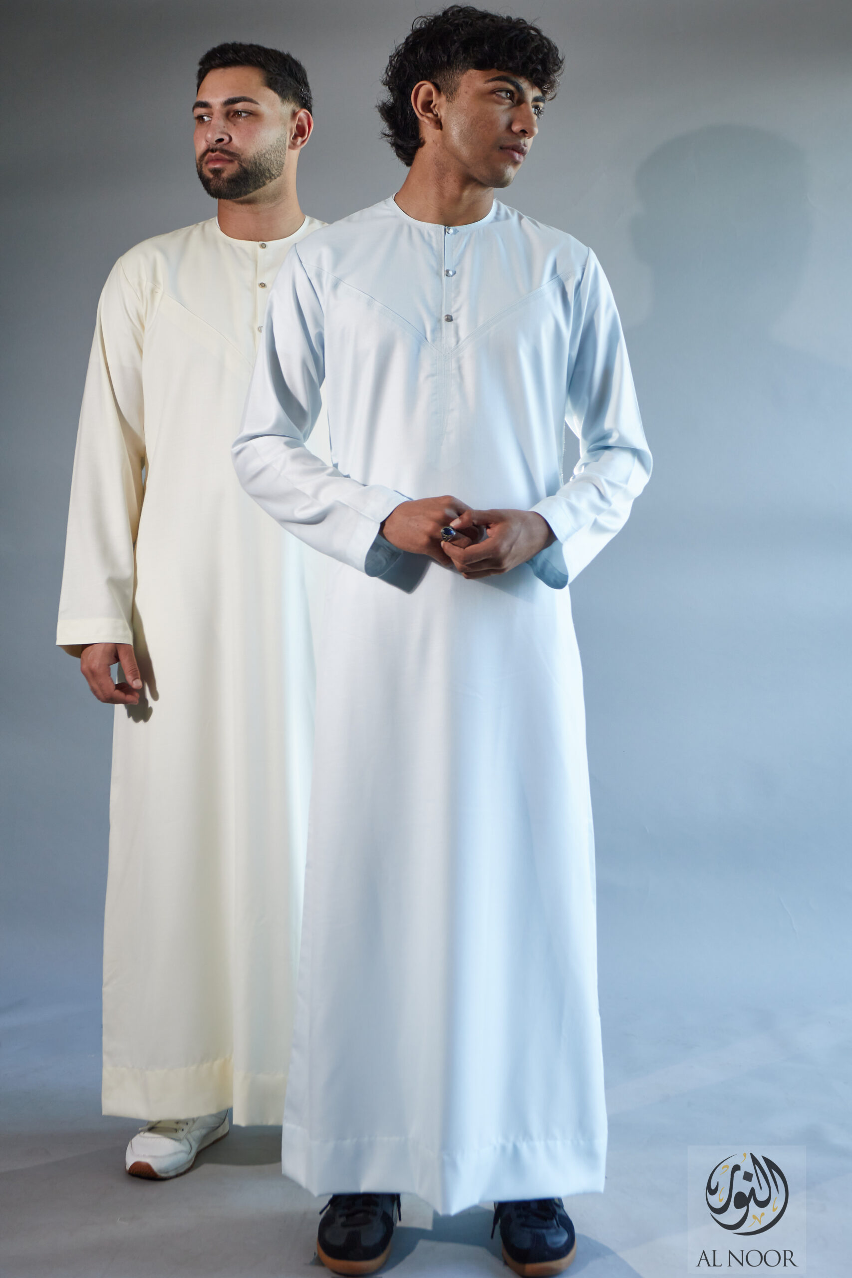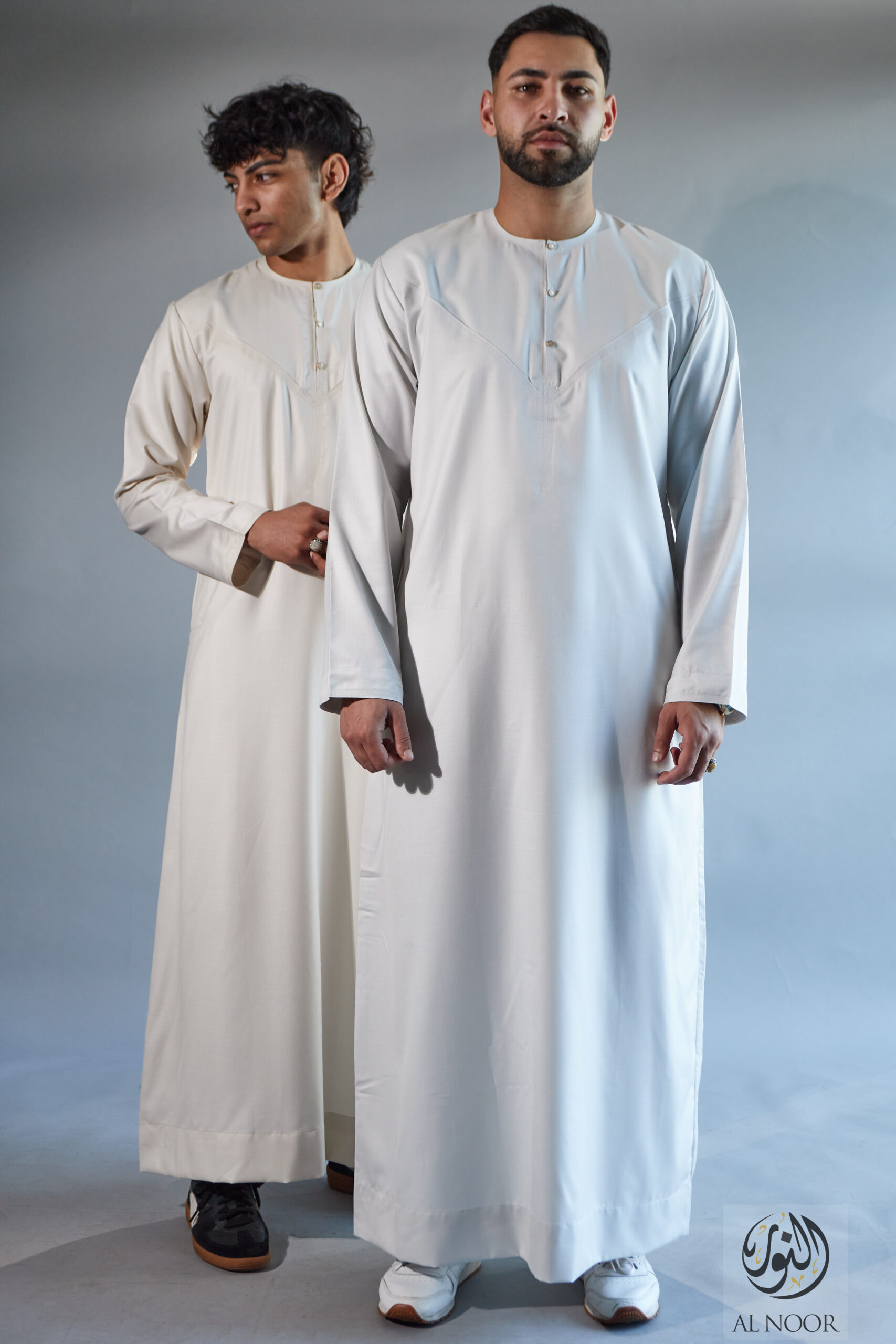 Al Noor Luxuriously soft Summer Linen Emirati collarless thobe featuring signature metal buttons