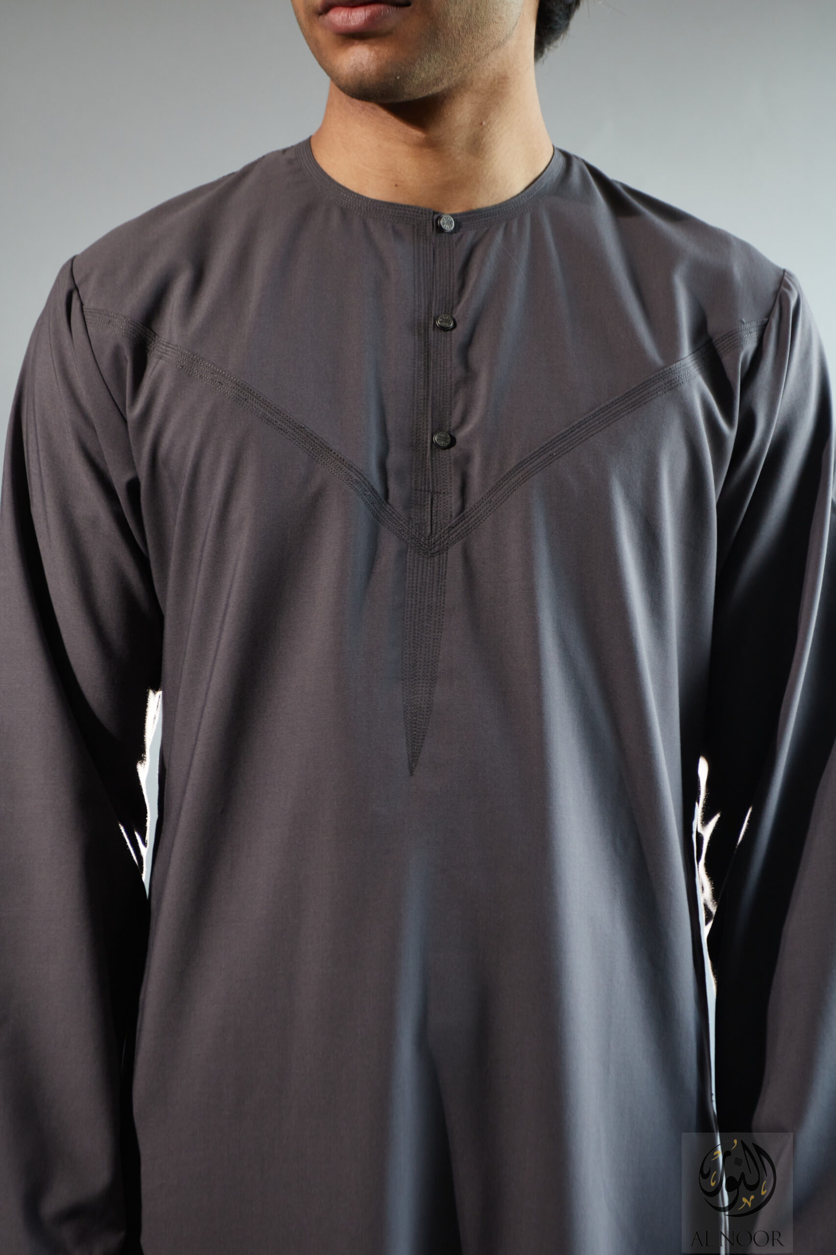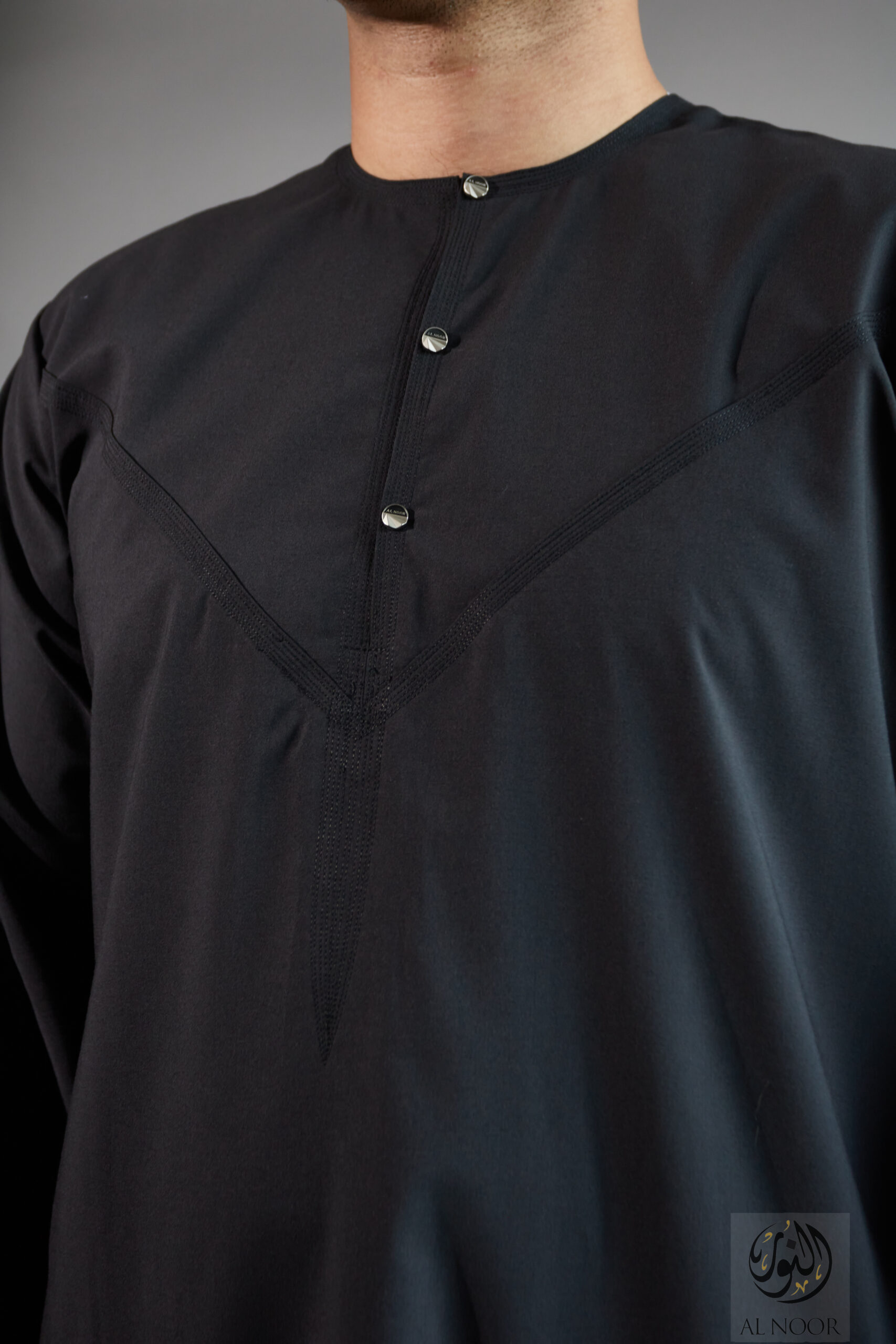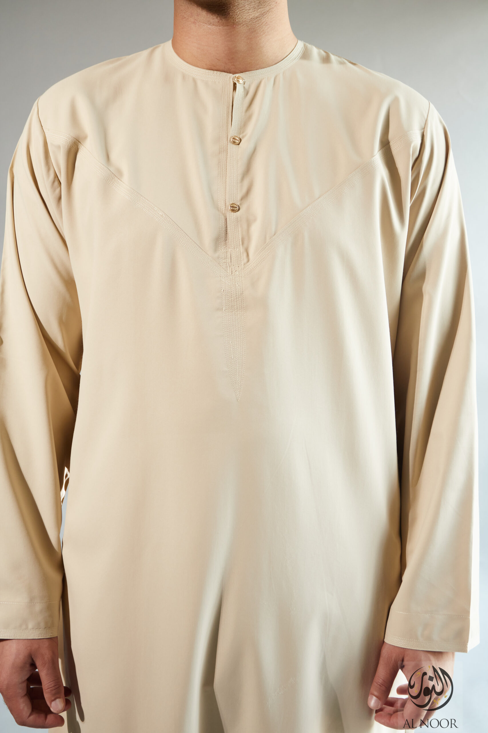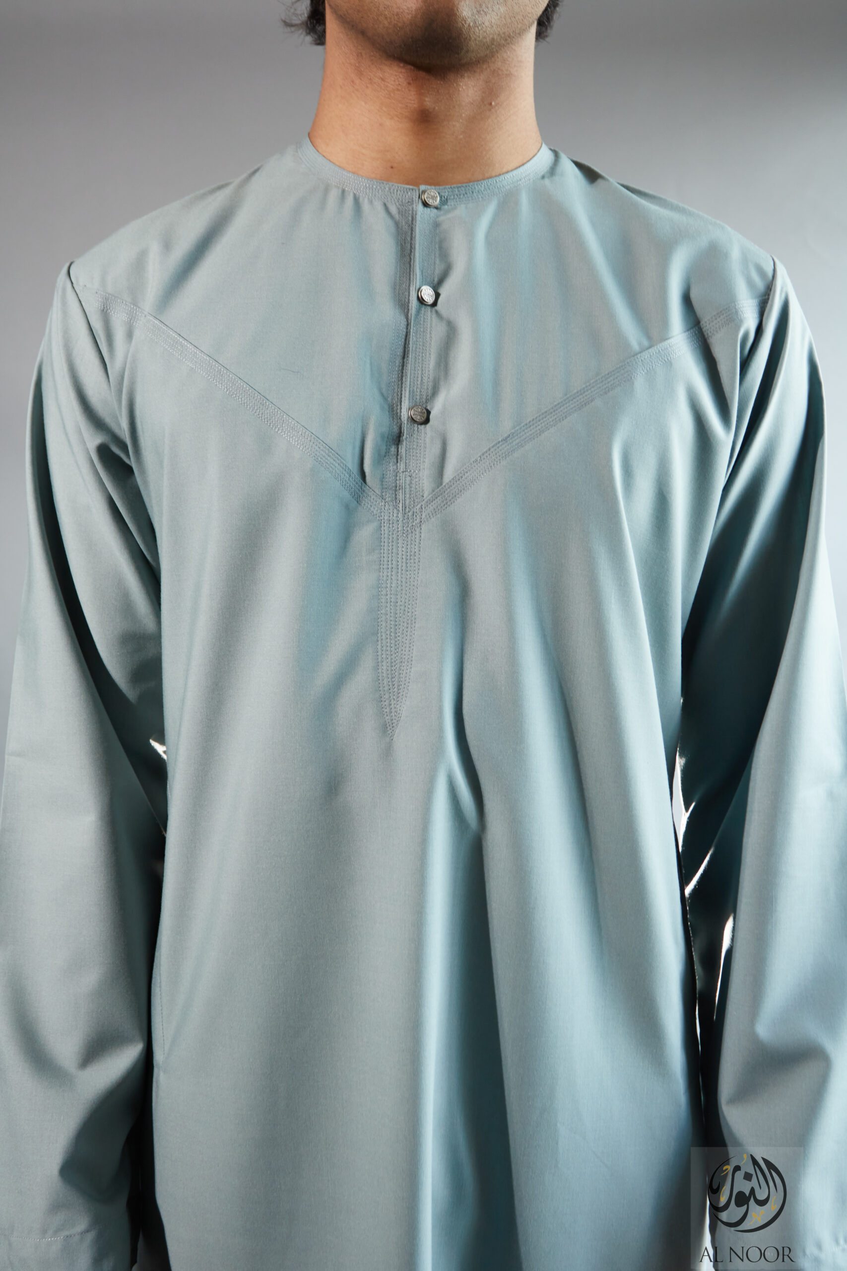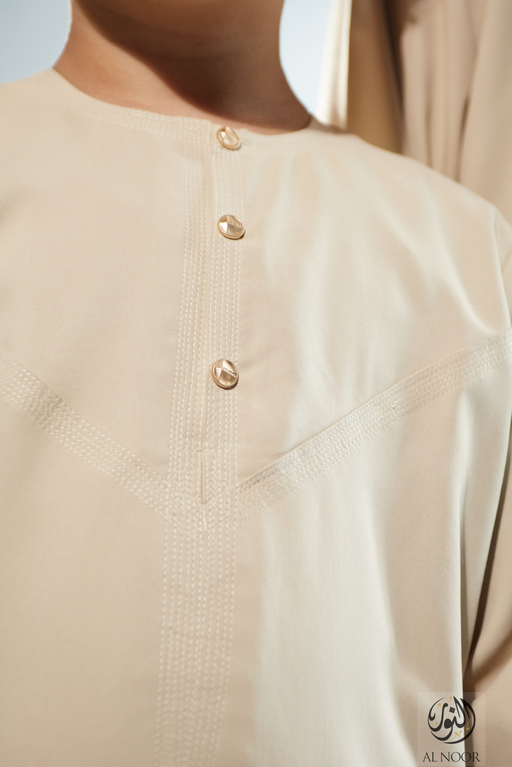 Collarless thobe featuring round Al Noor signature buttons (soft fabric)