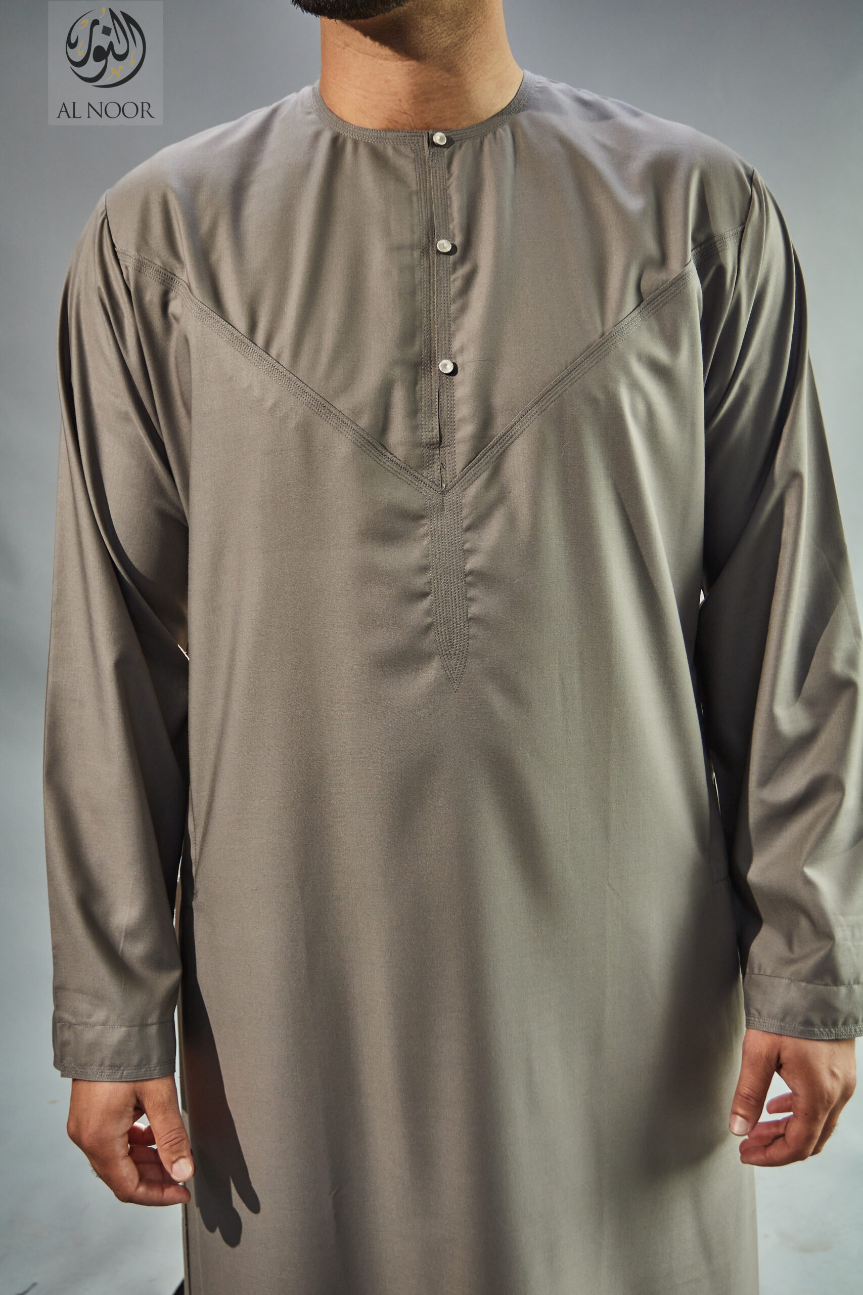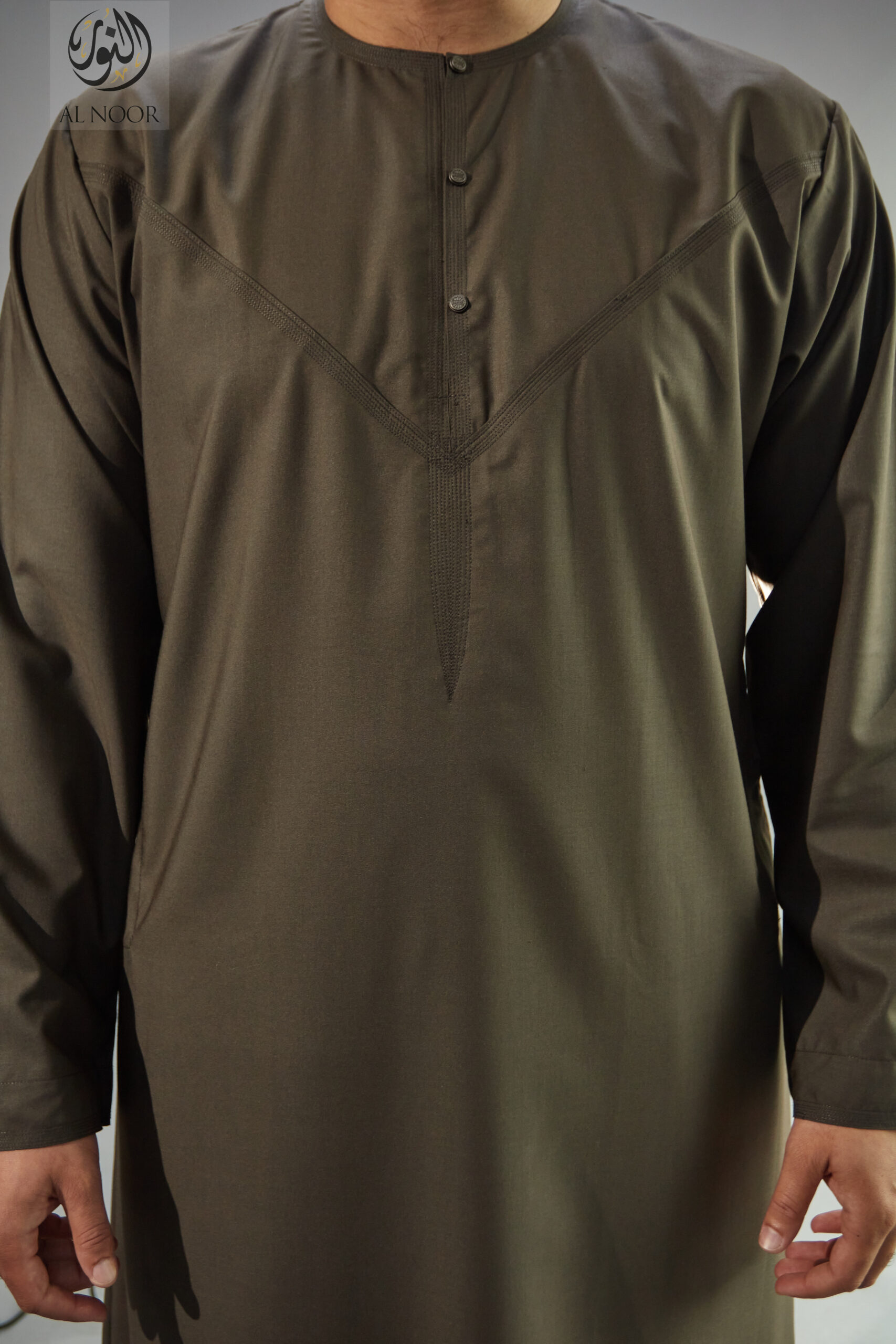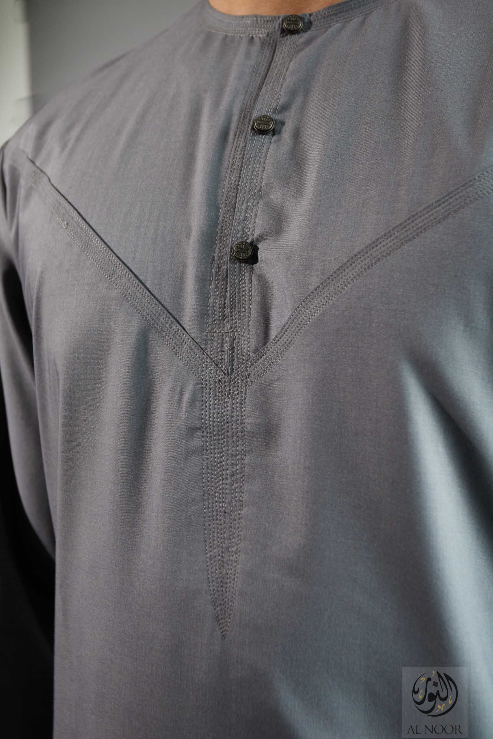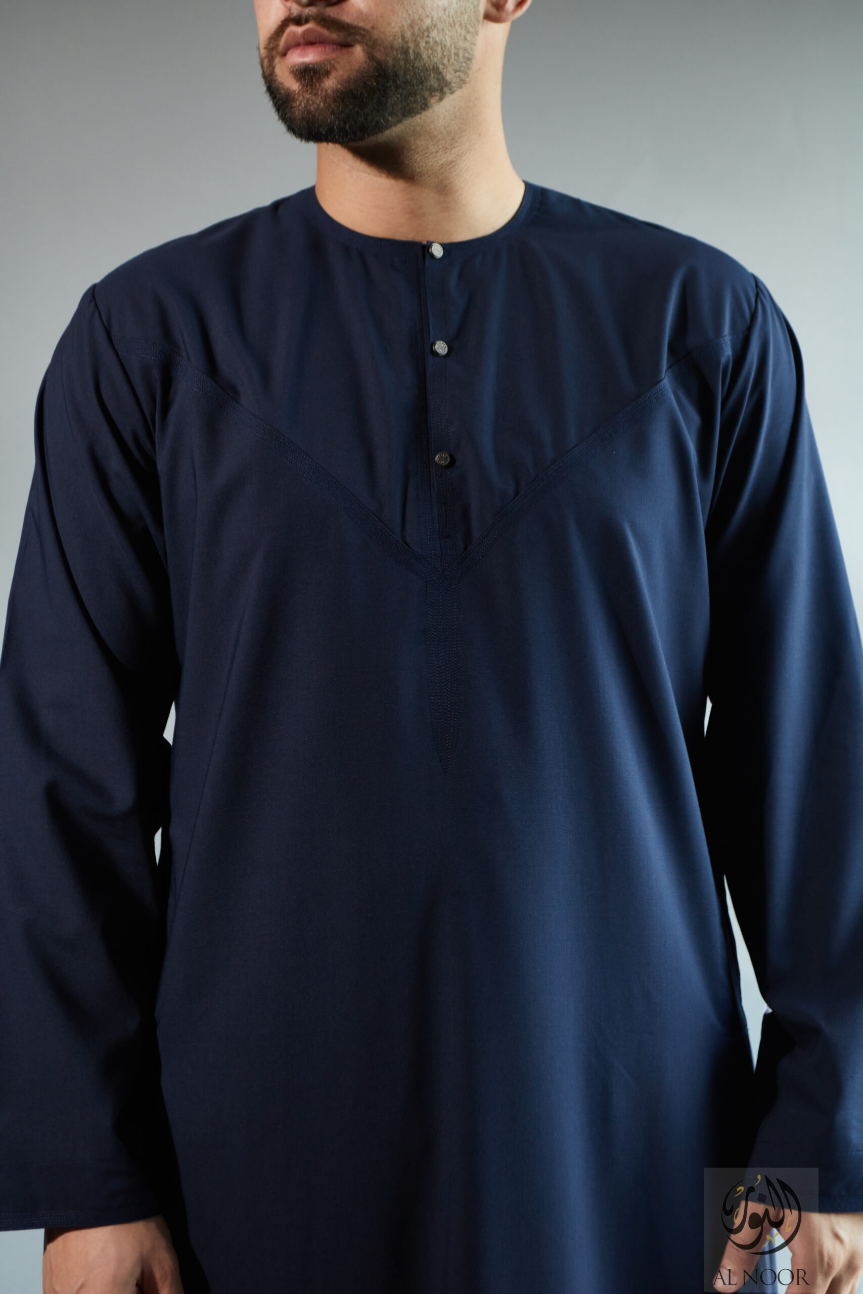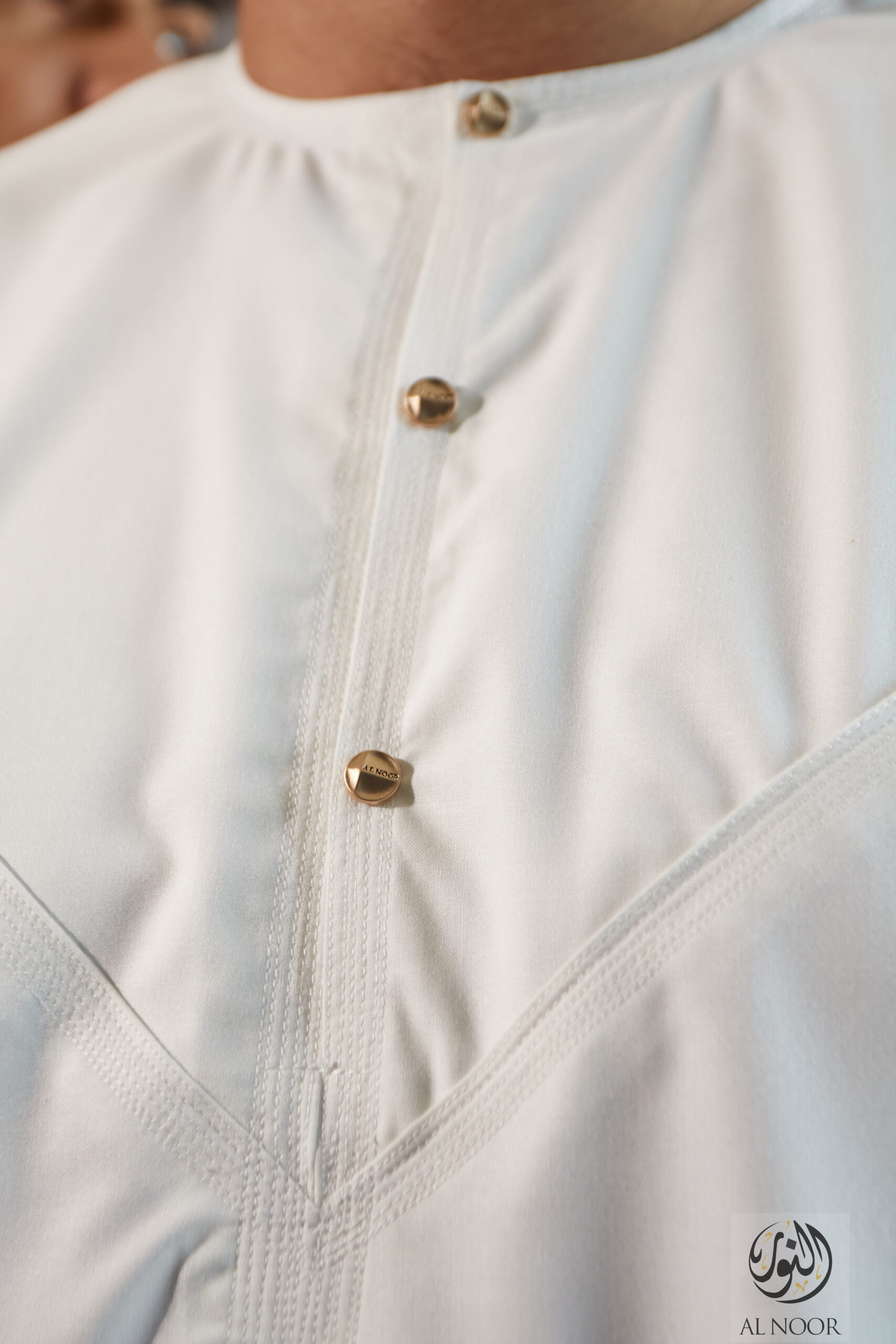 Collarless thobe featuring round Al Noor signature buttons (soft fabric)
