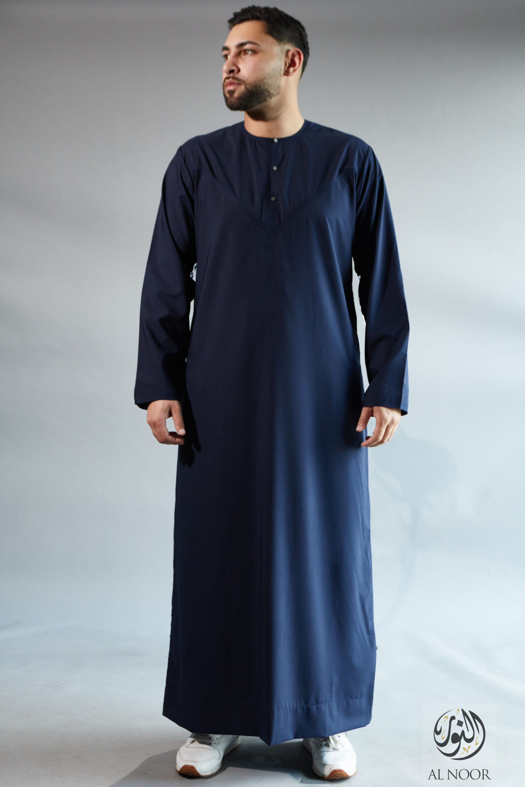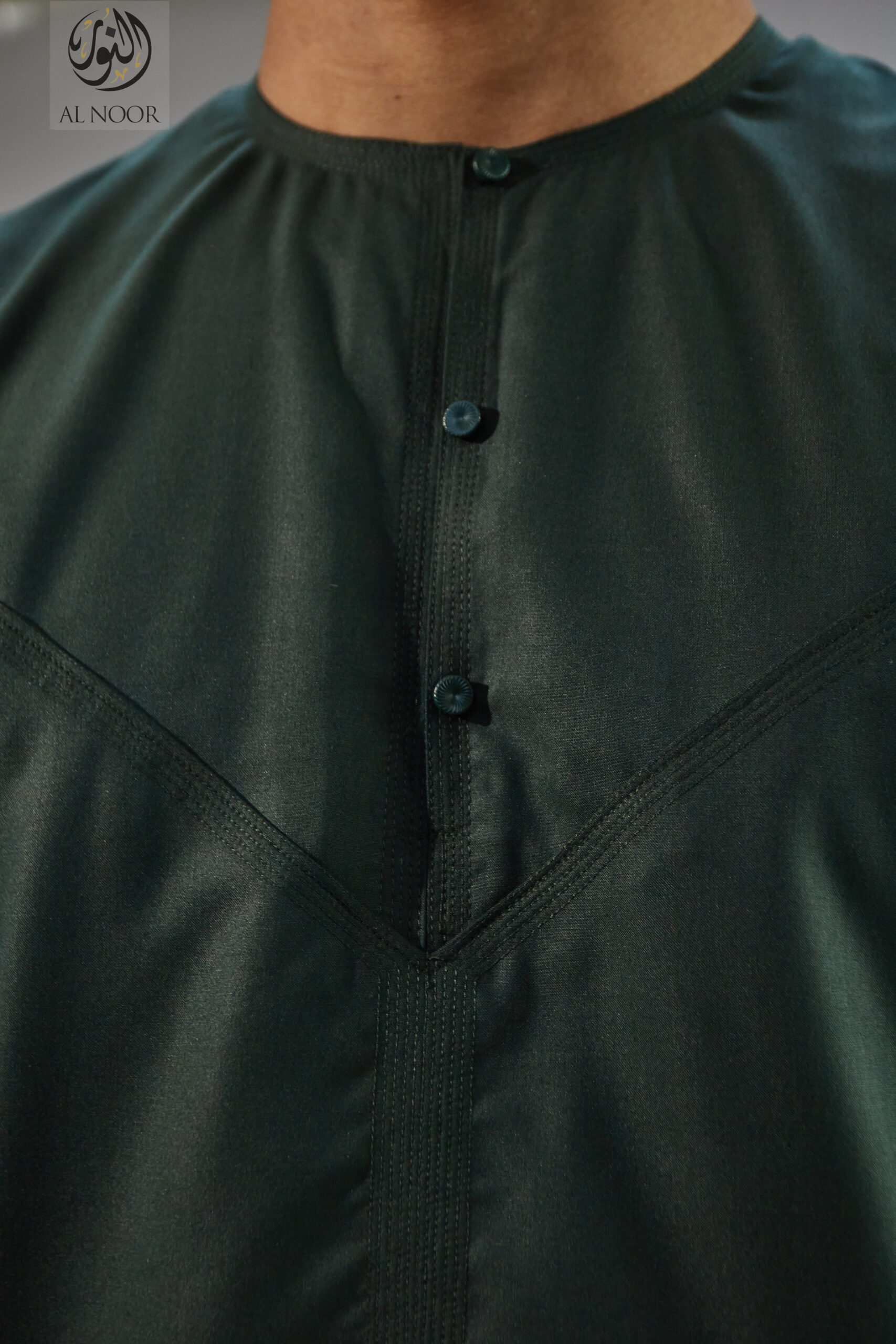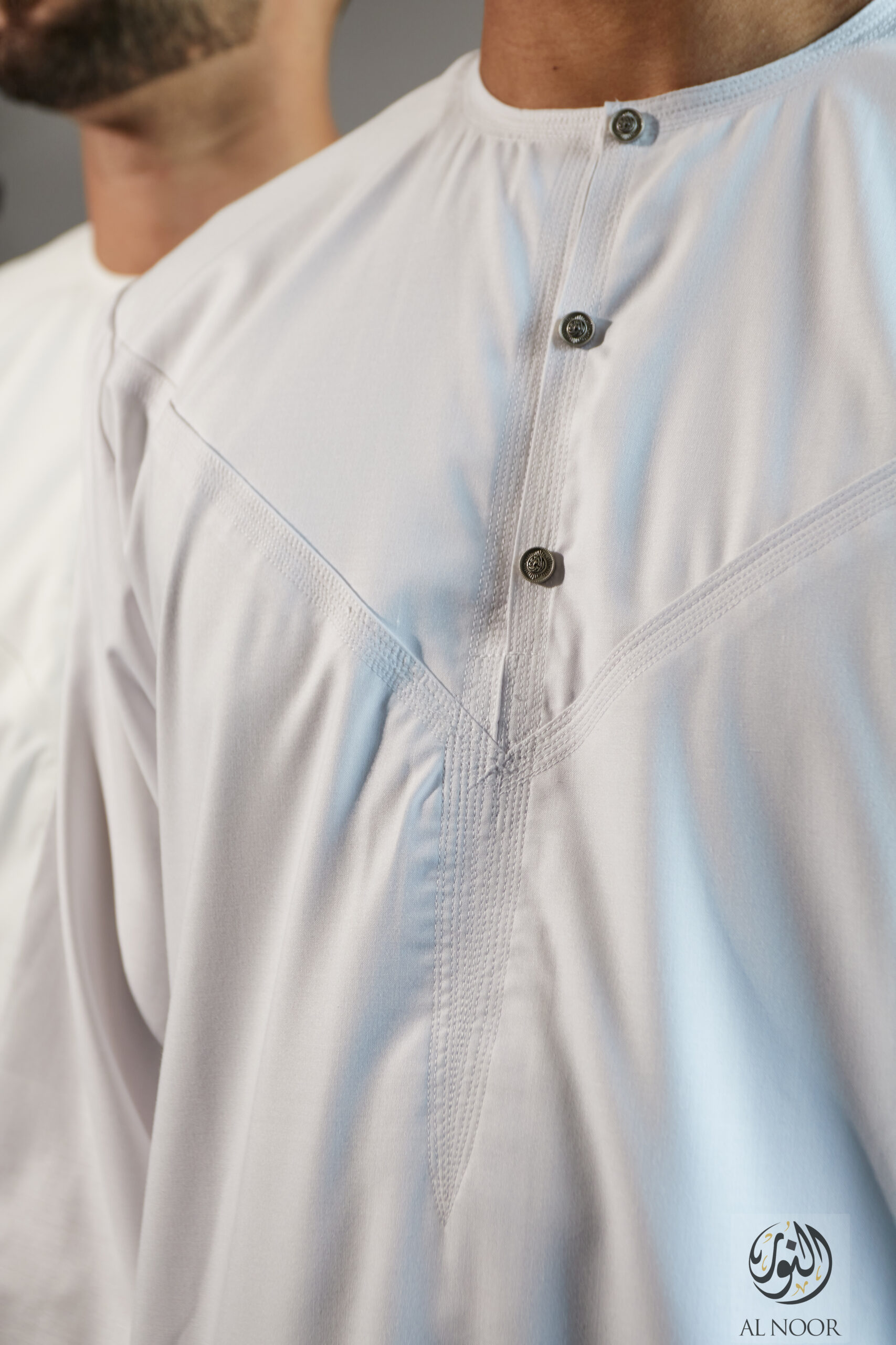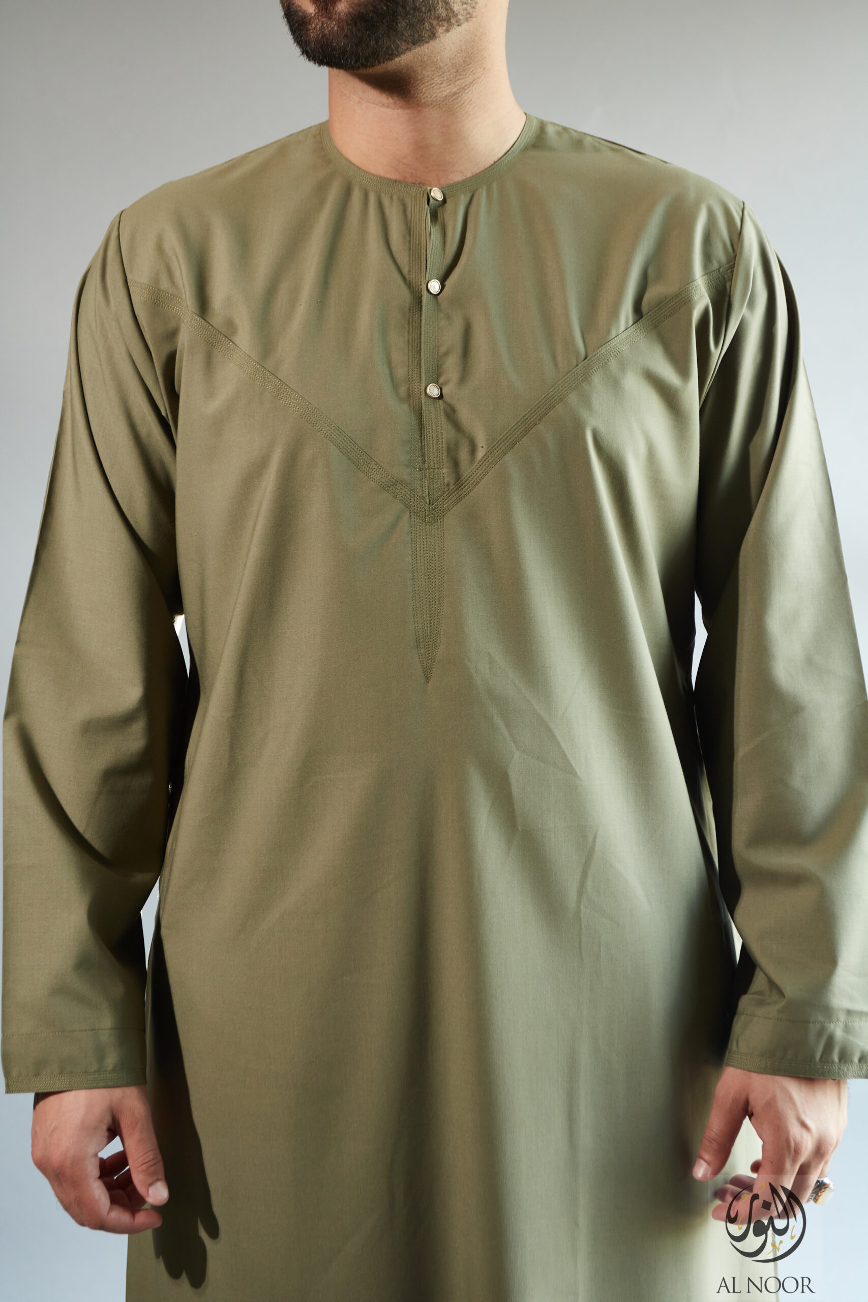 Collarless thobe featuring round Al Noor signature buttons (soft fabric)