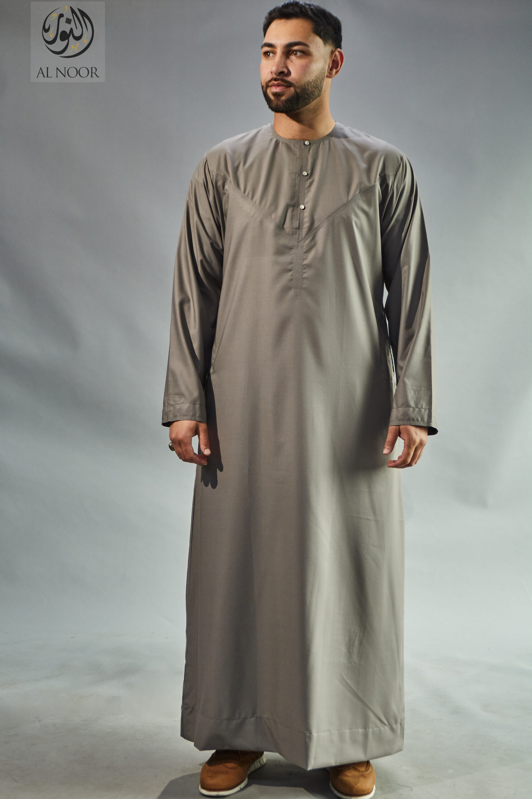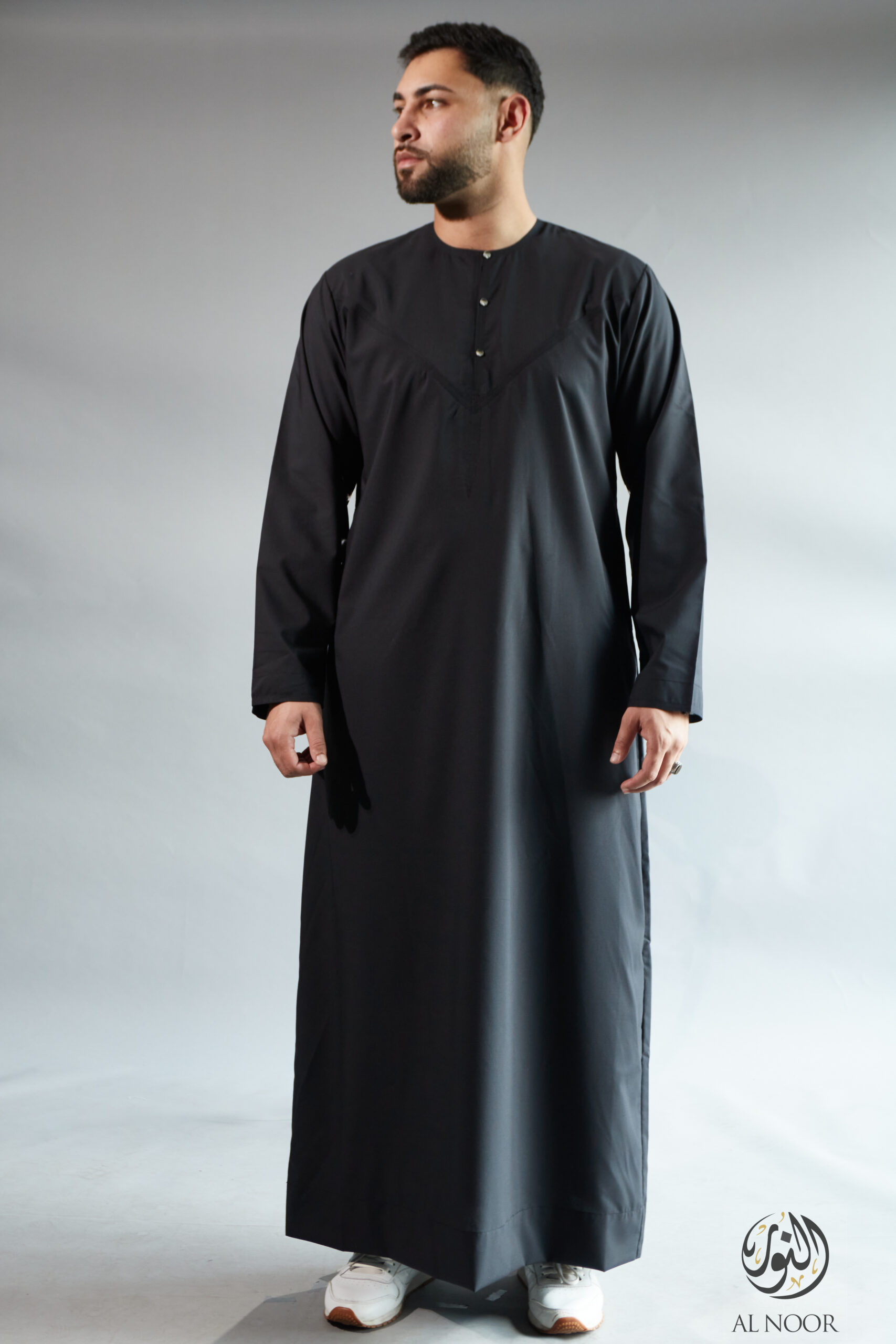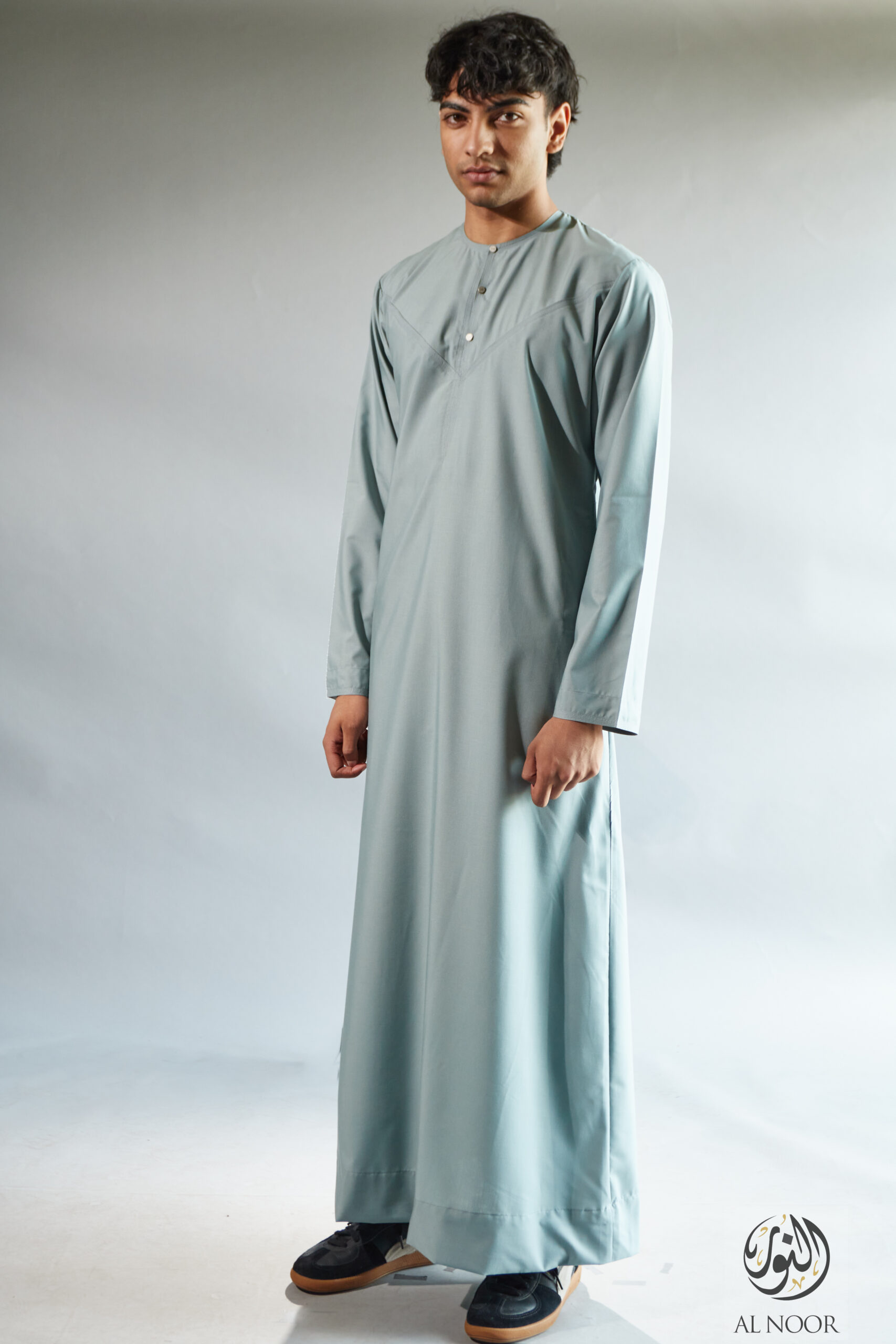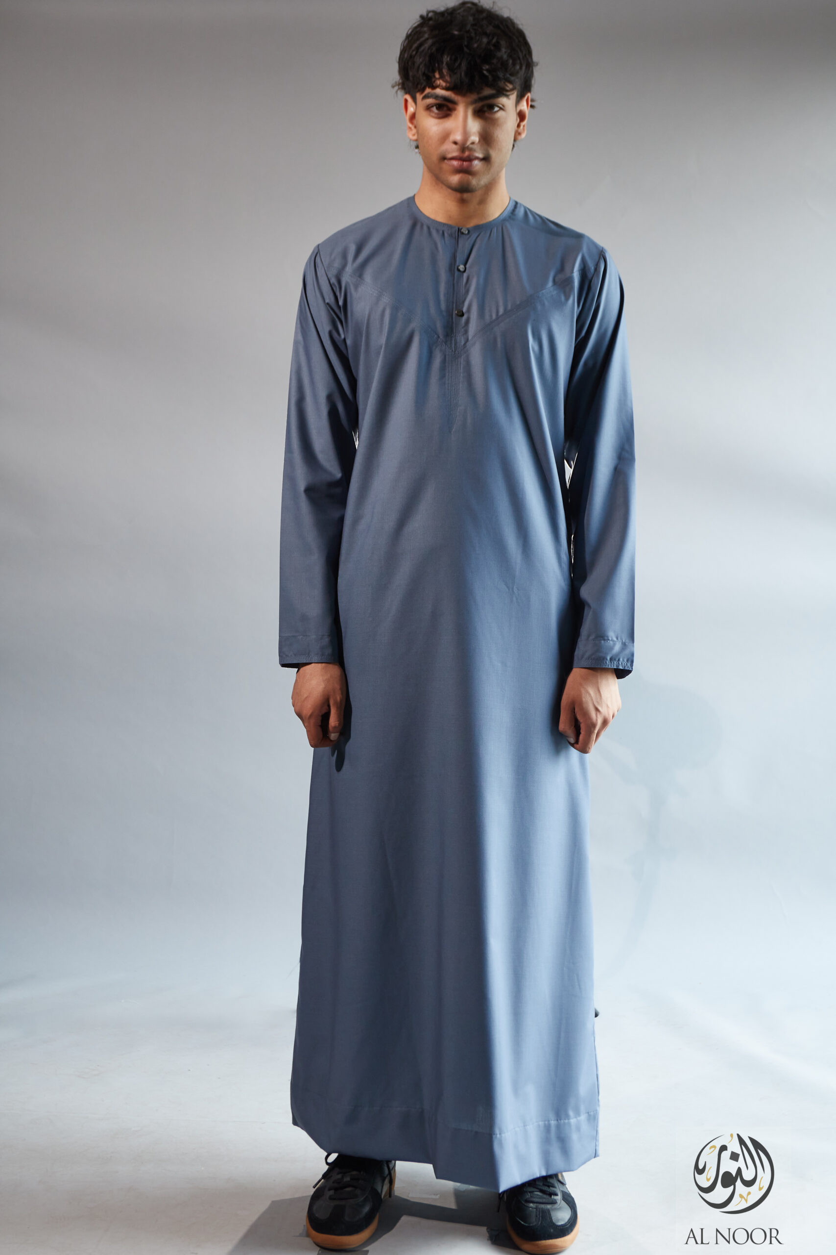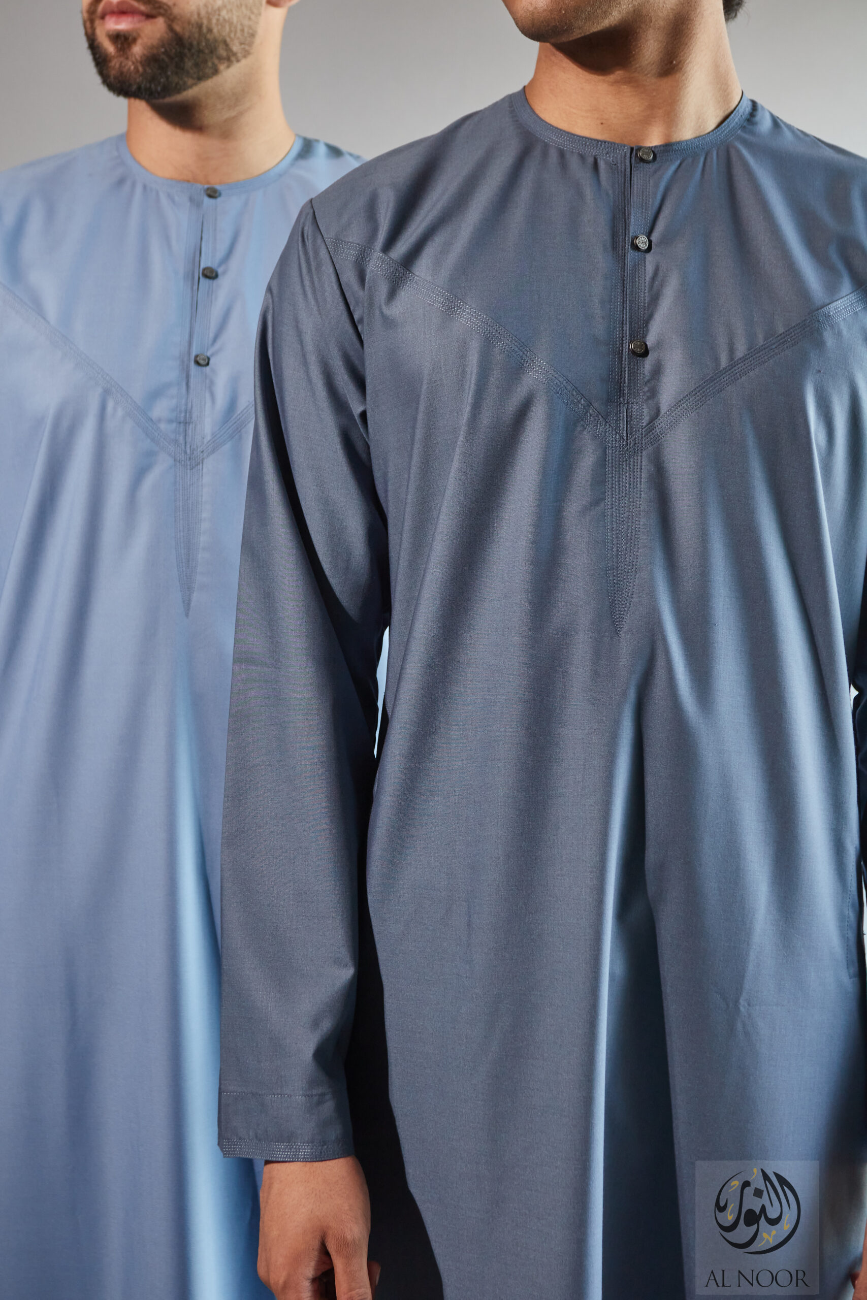 Collarless thobe featuring round Al Noor signature buttons (soft fabric)