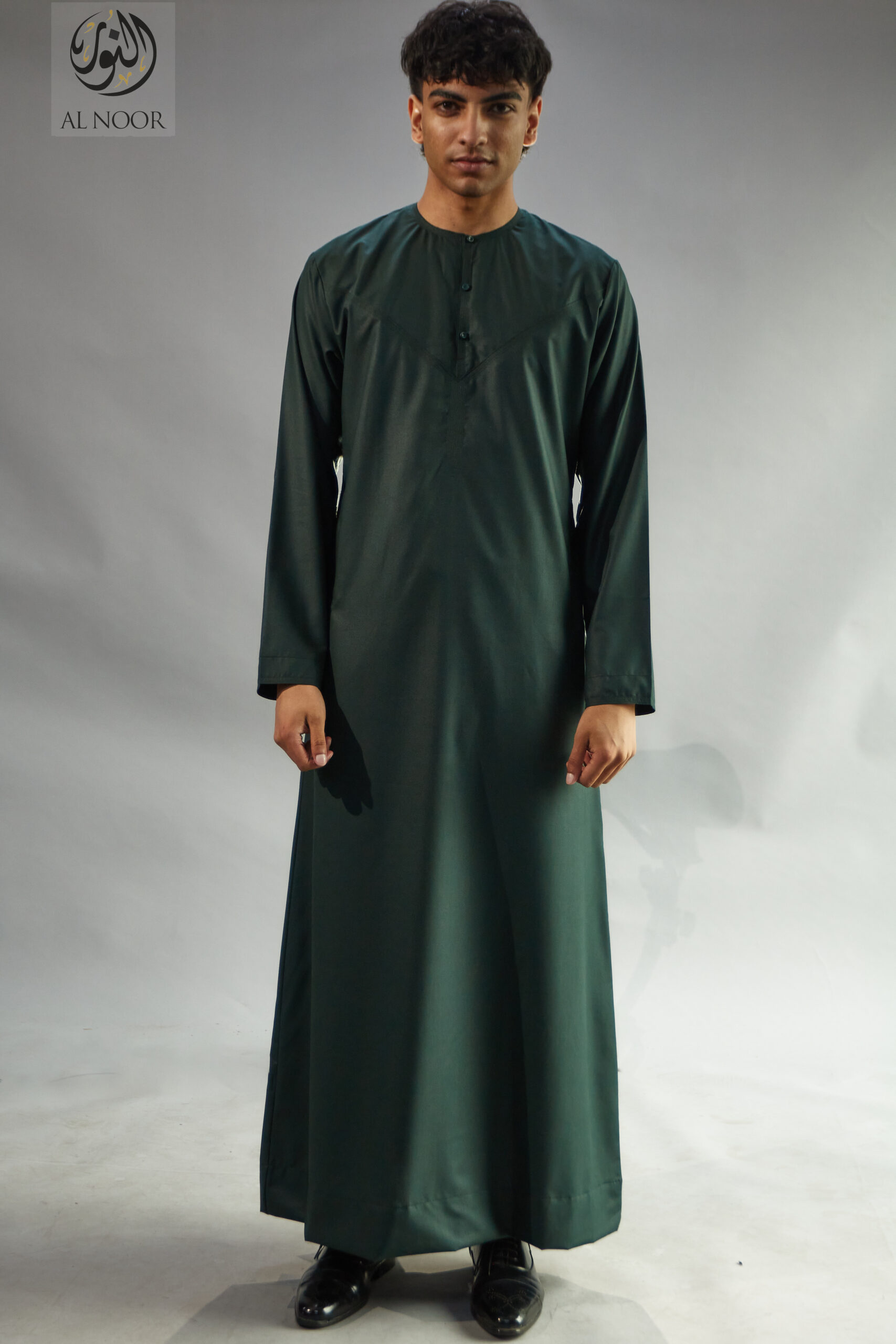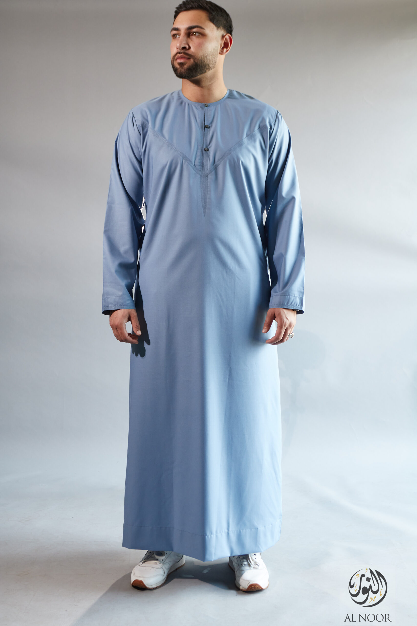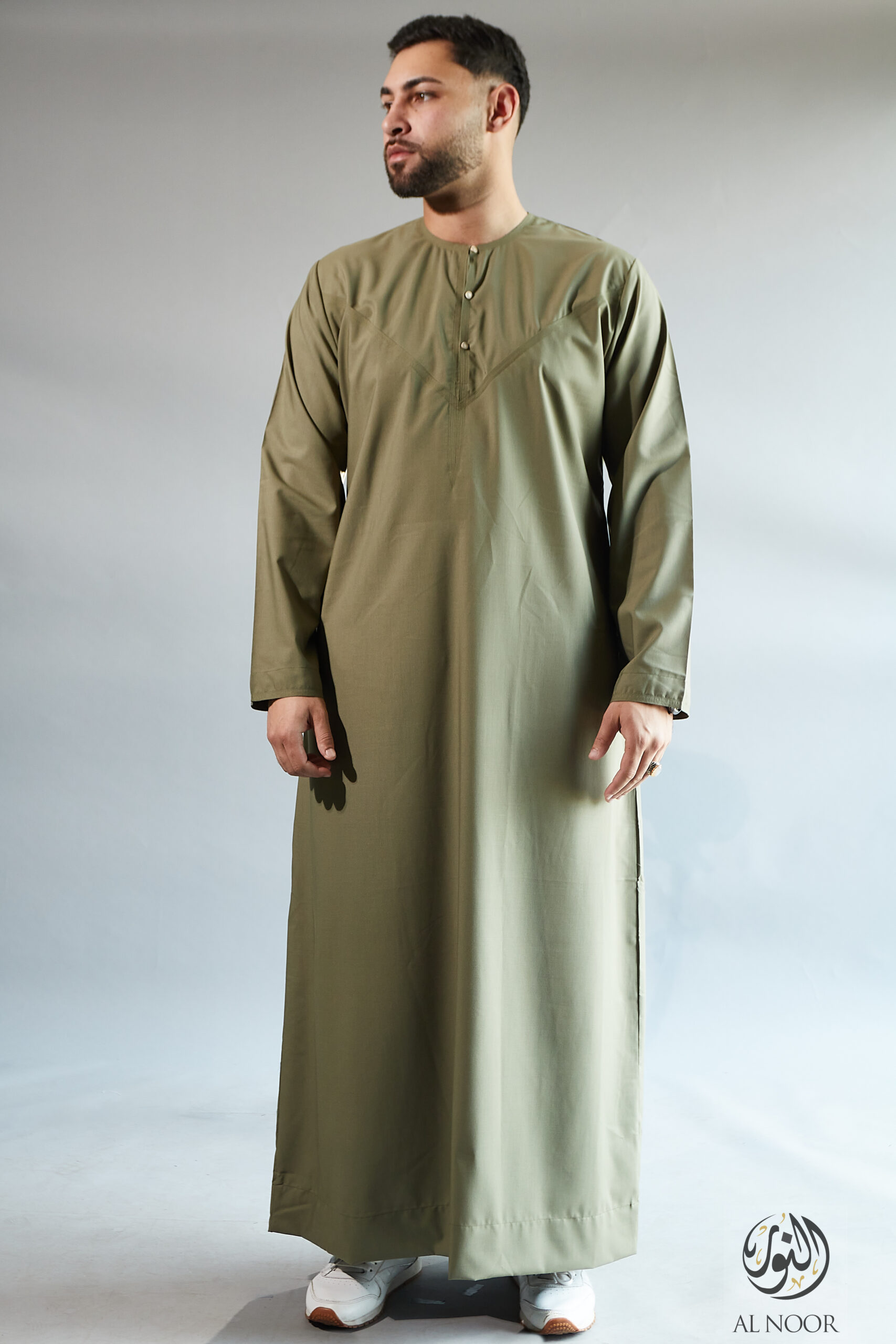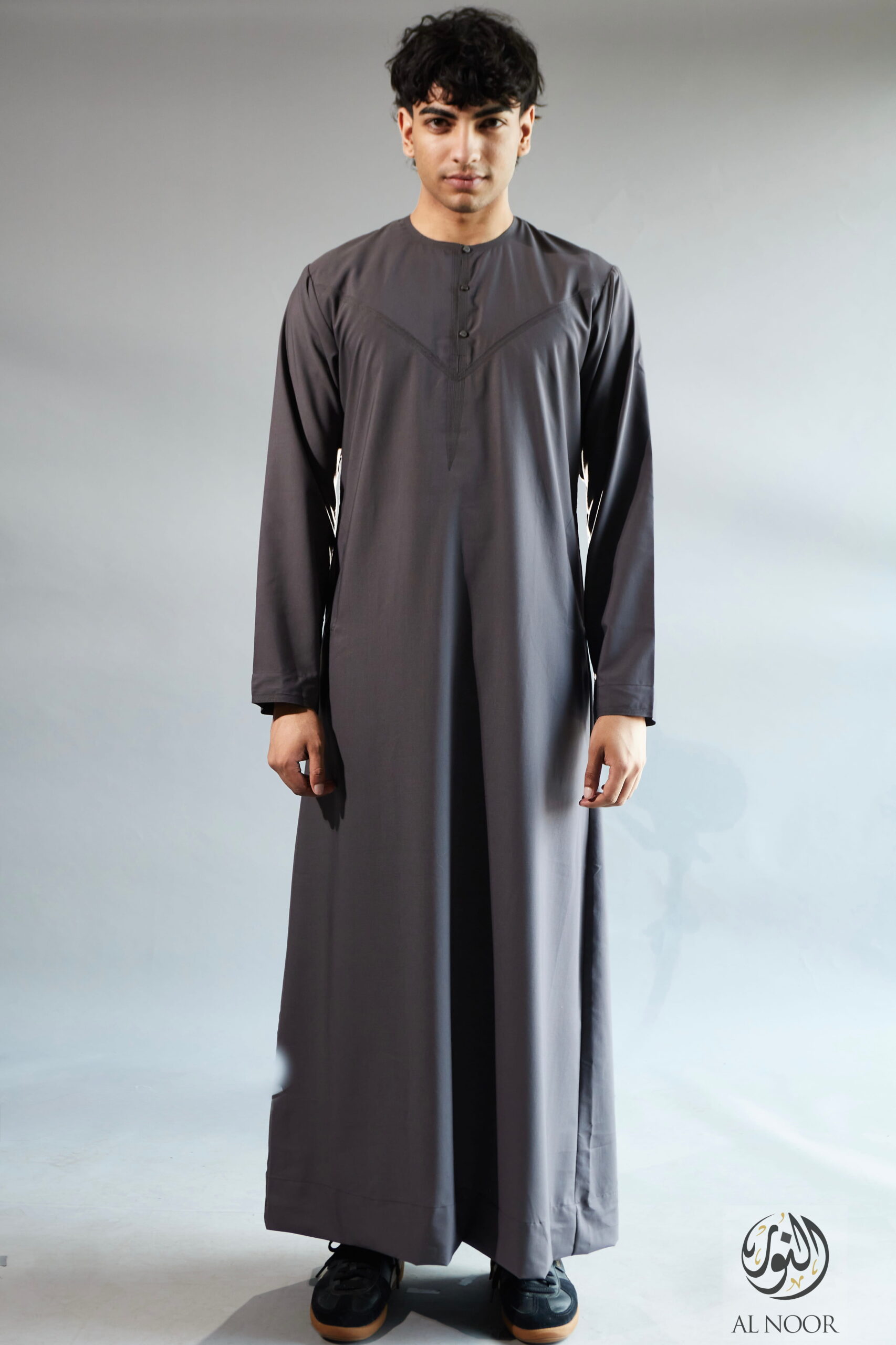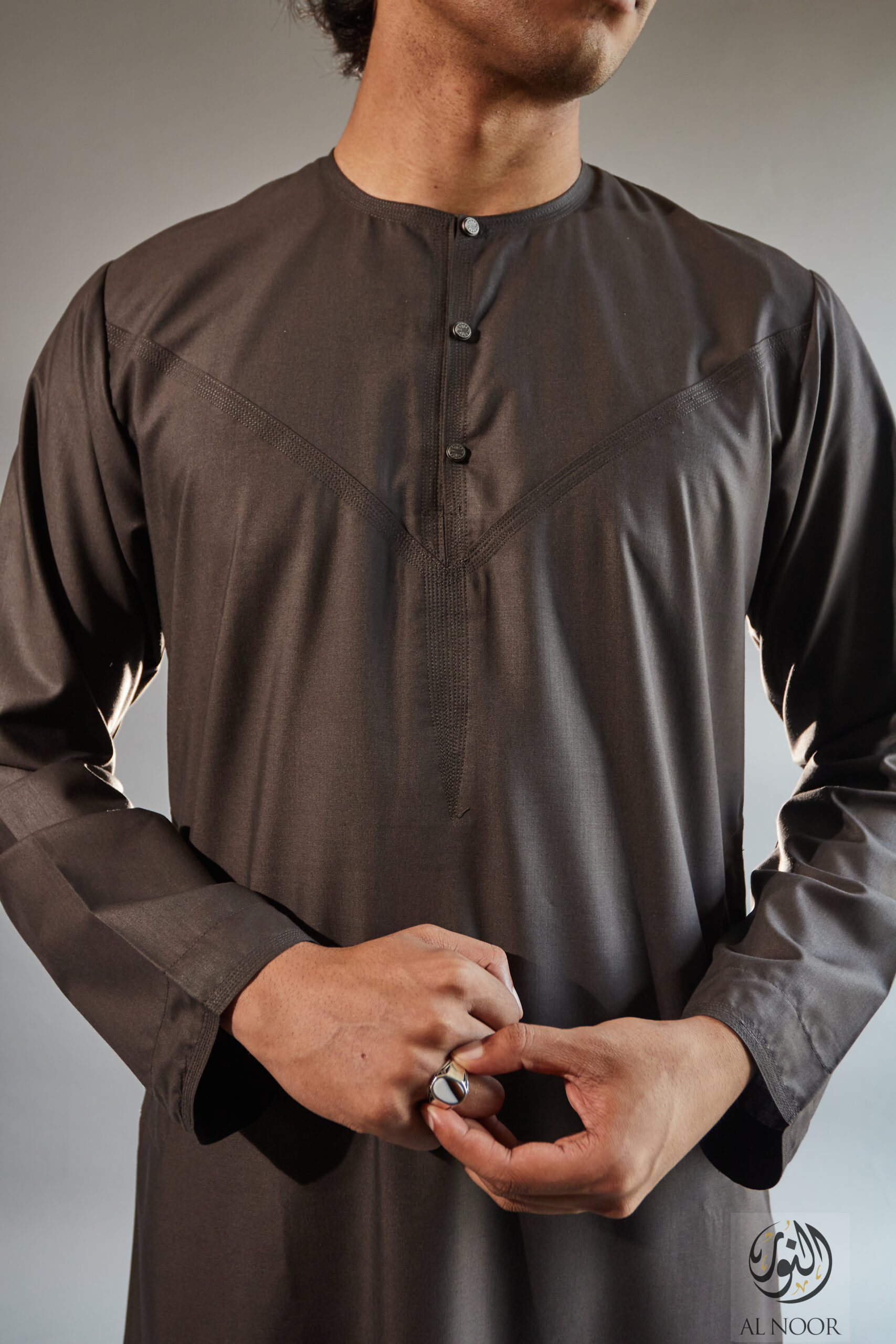 Collarless thobe featuring round Al Noor signature buttons (soft fabric)