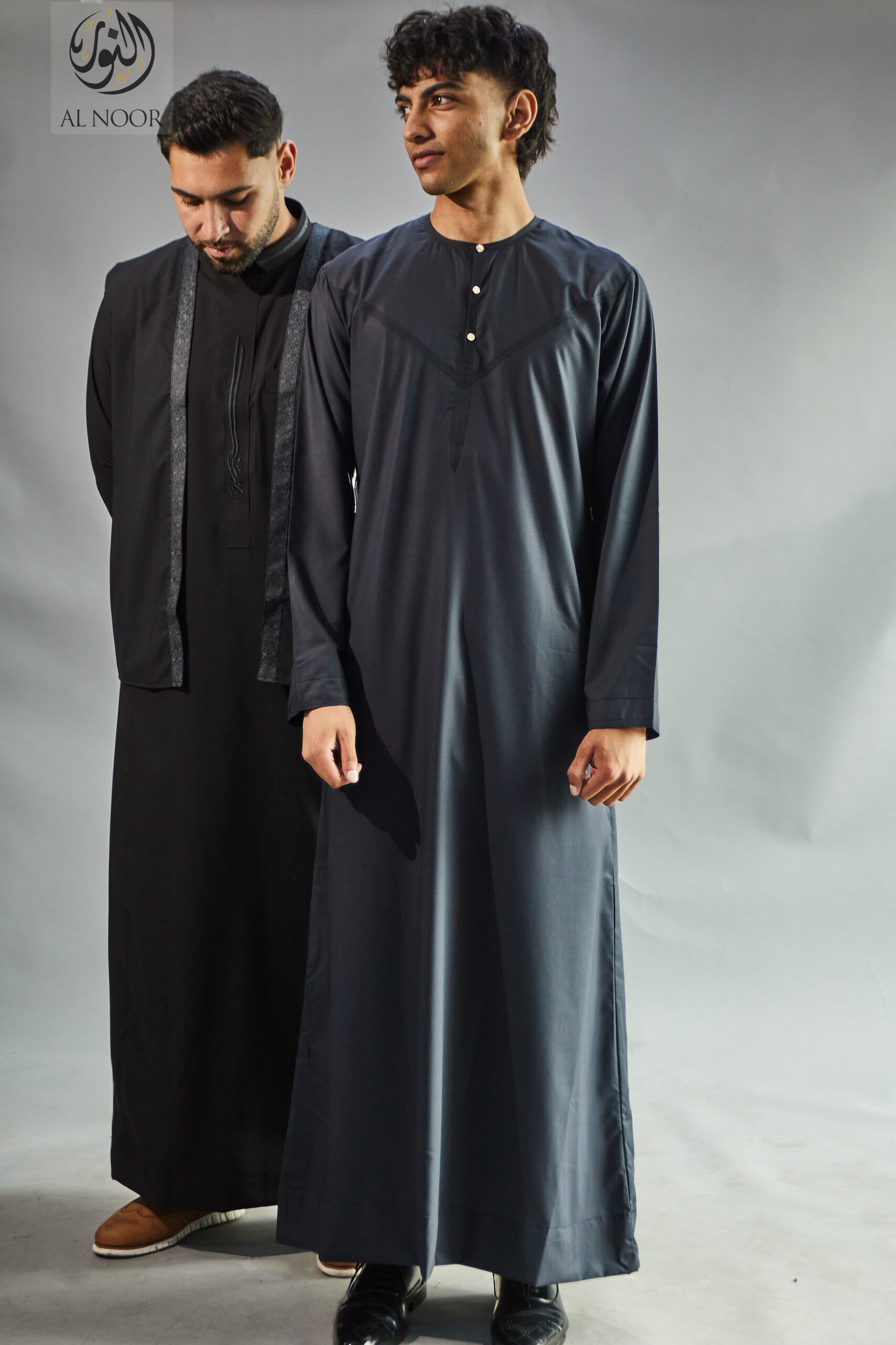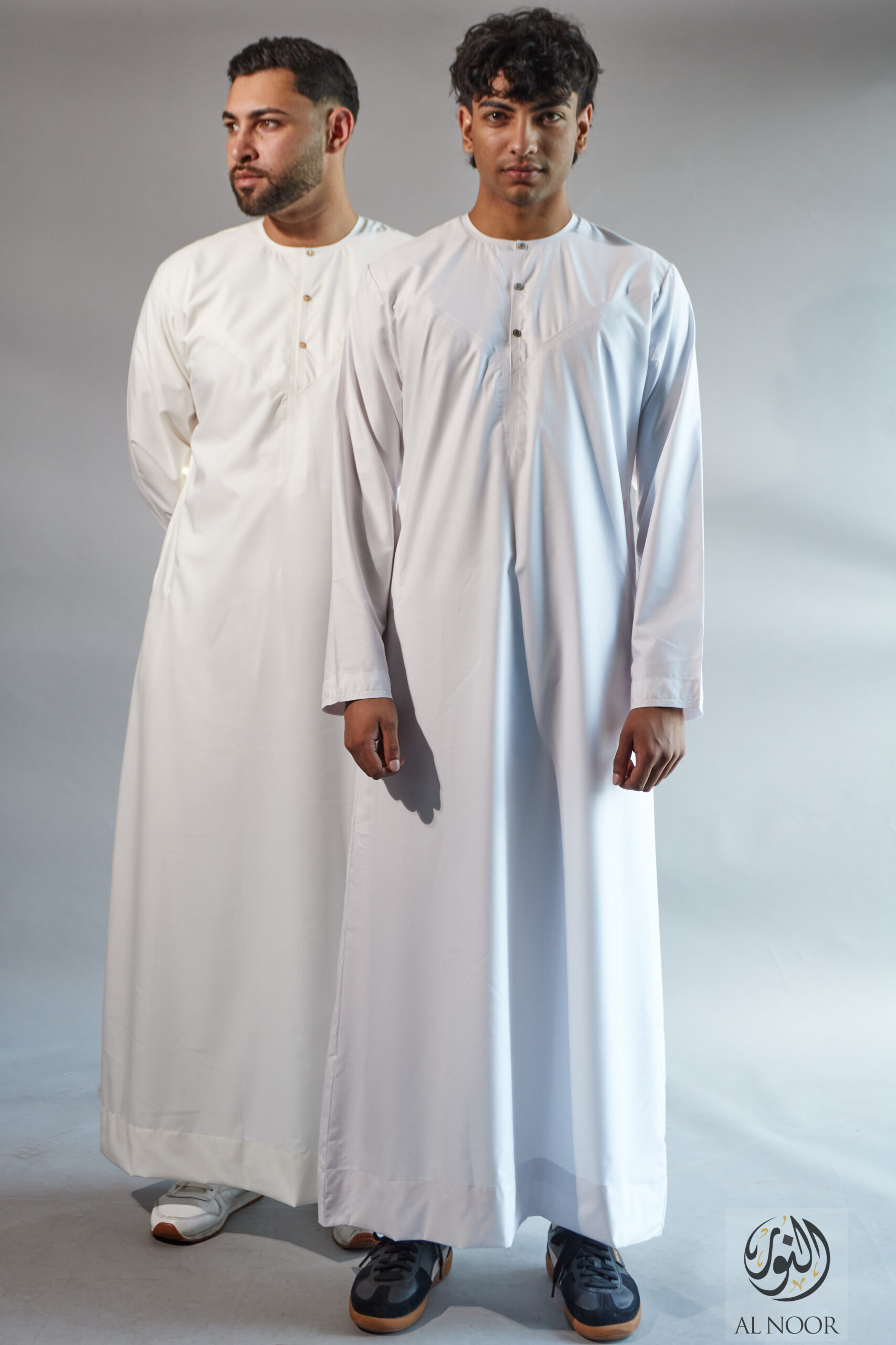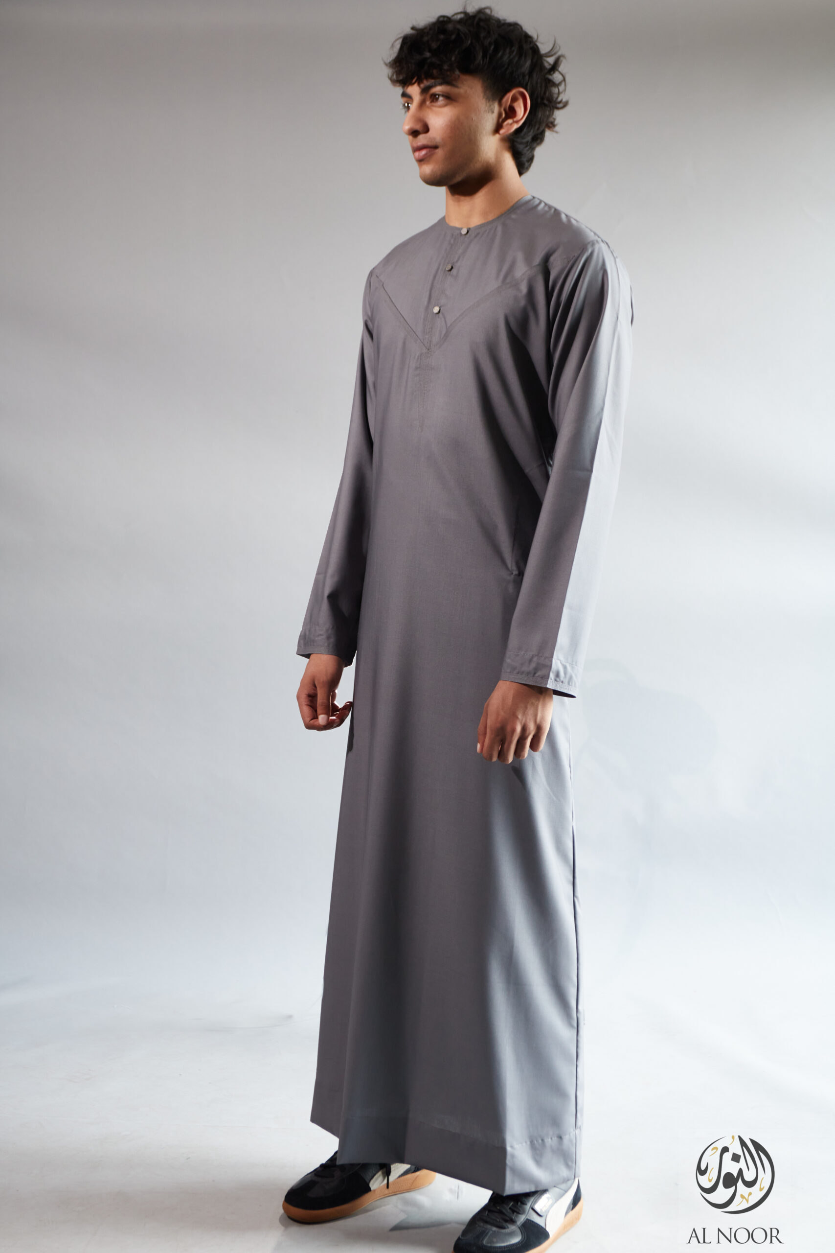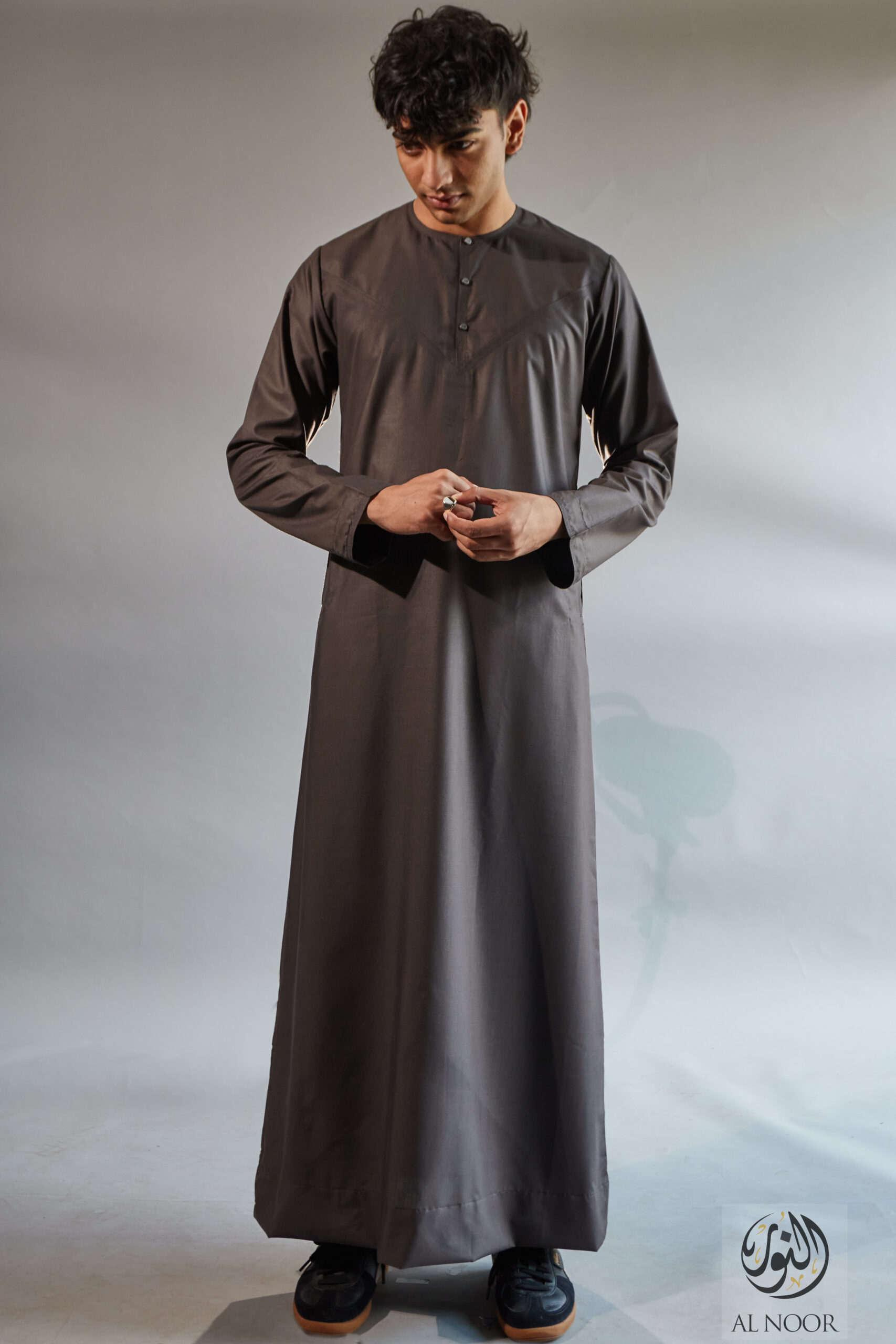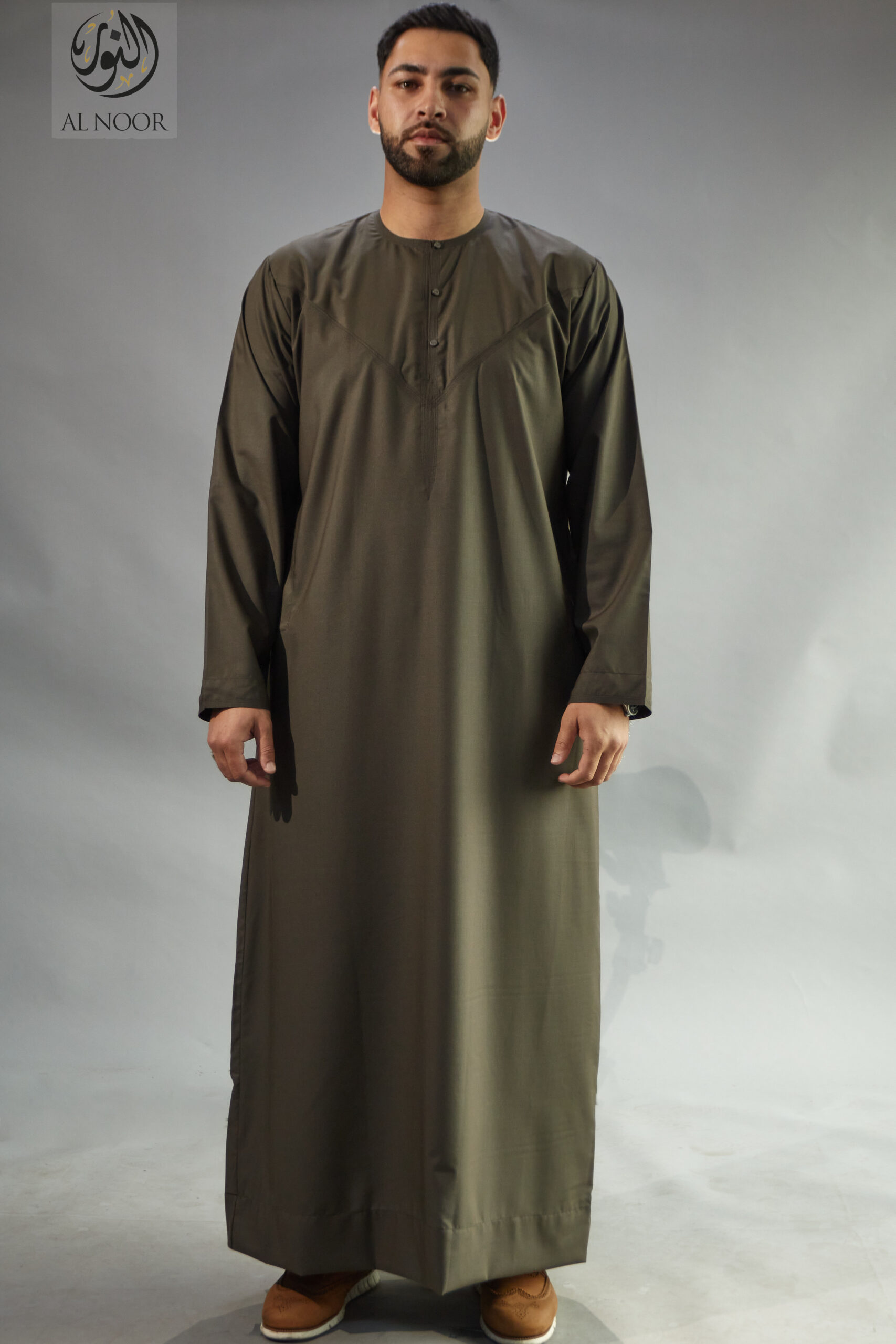 Collarless thobe featuring round Al Noor signature buttons (soft fabric)