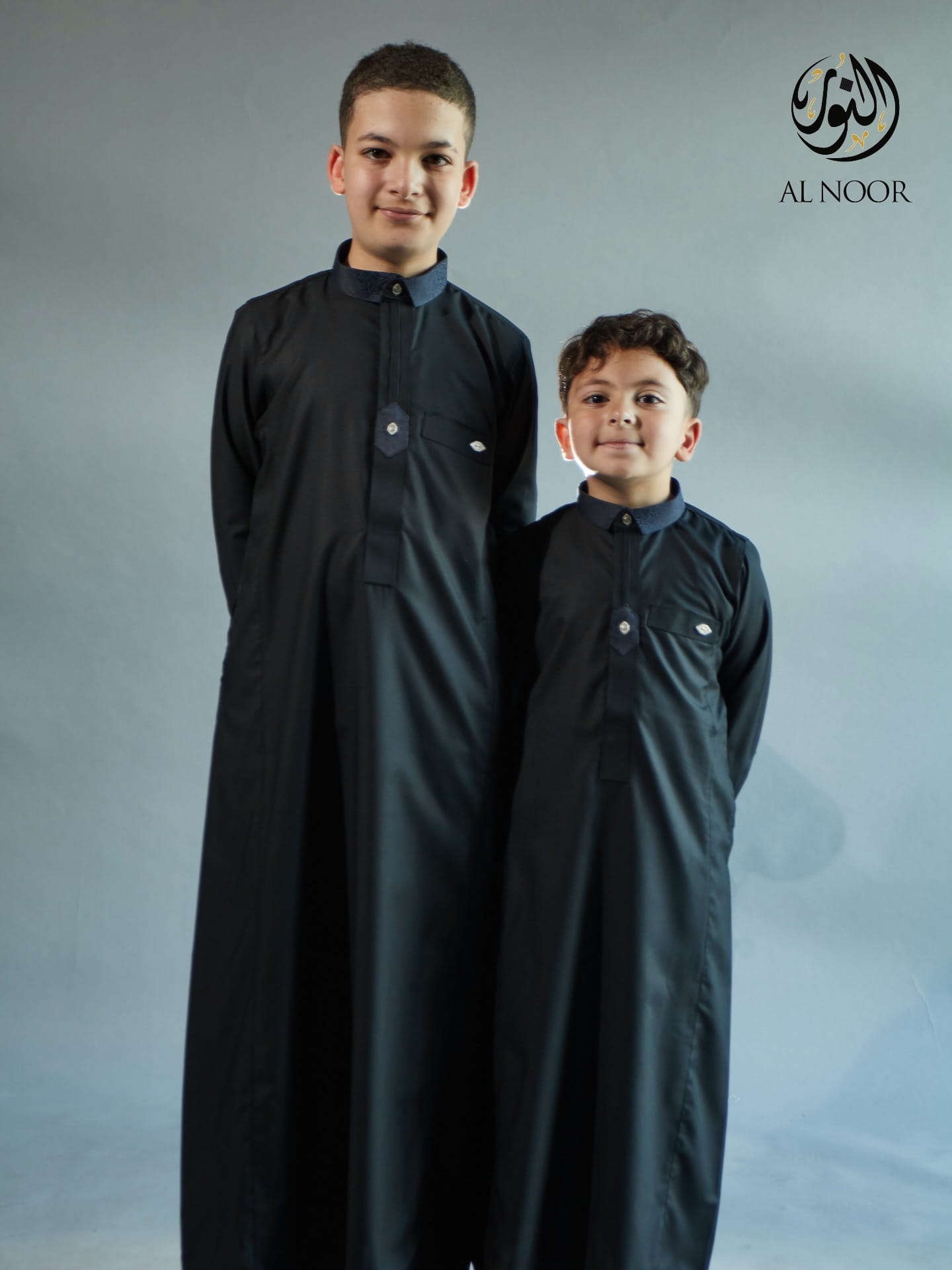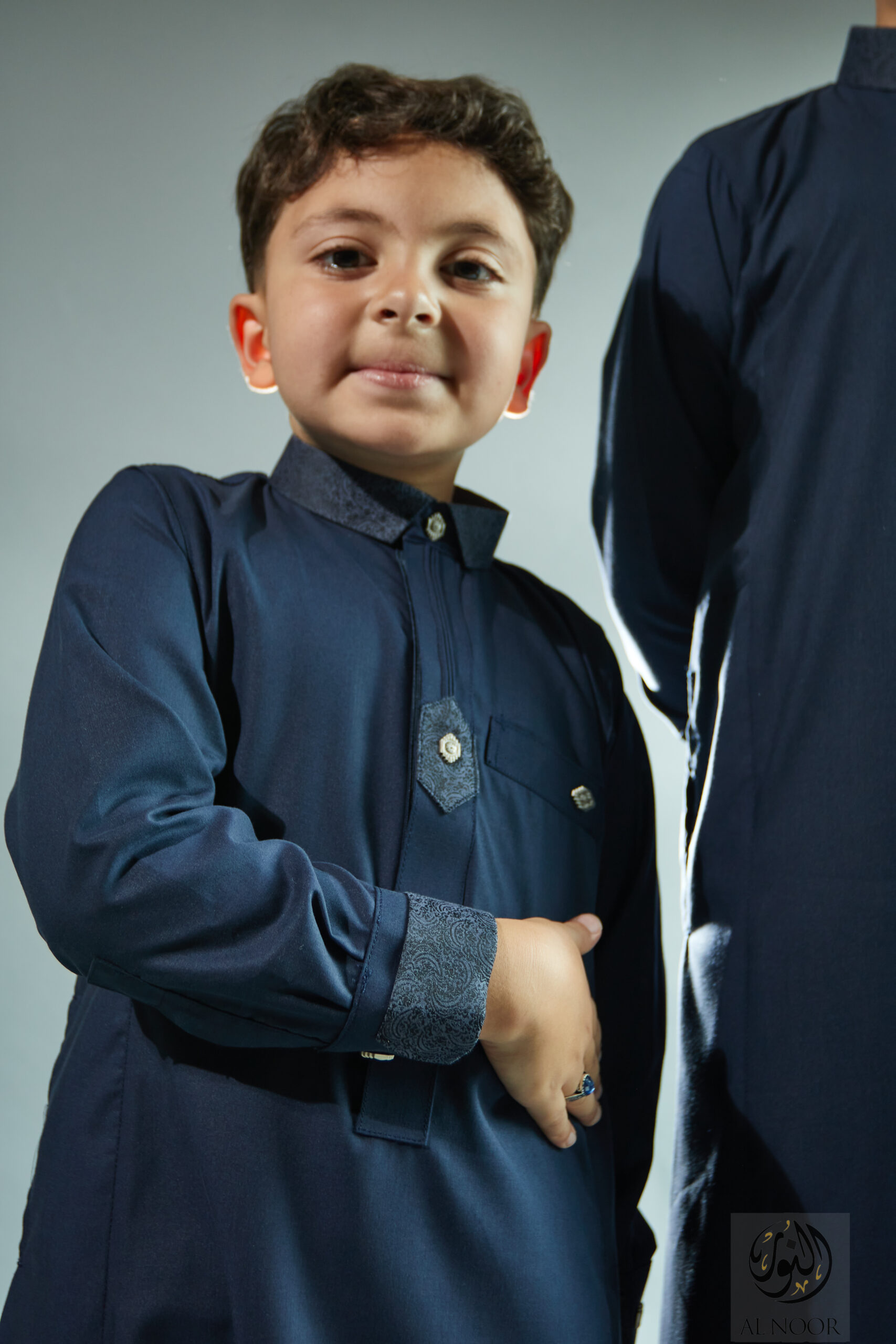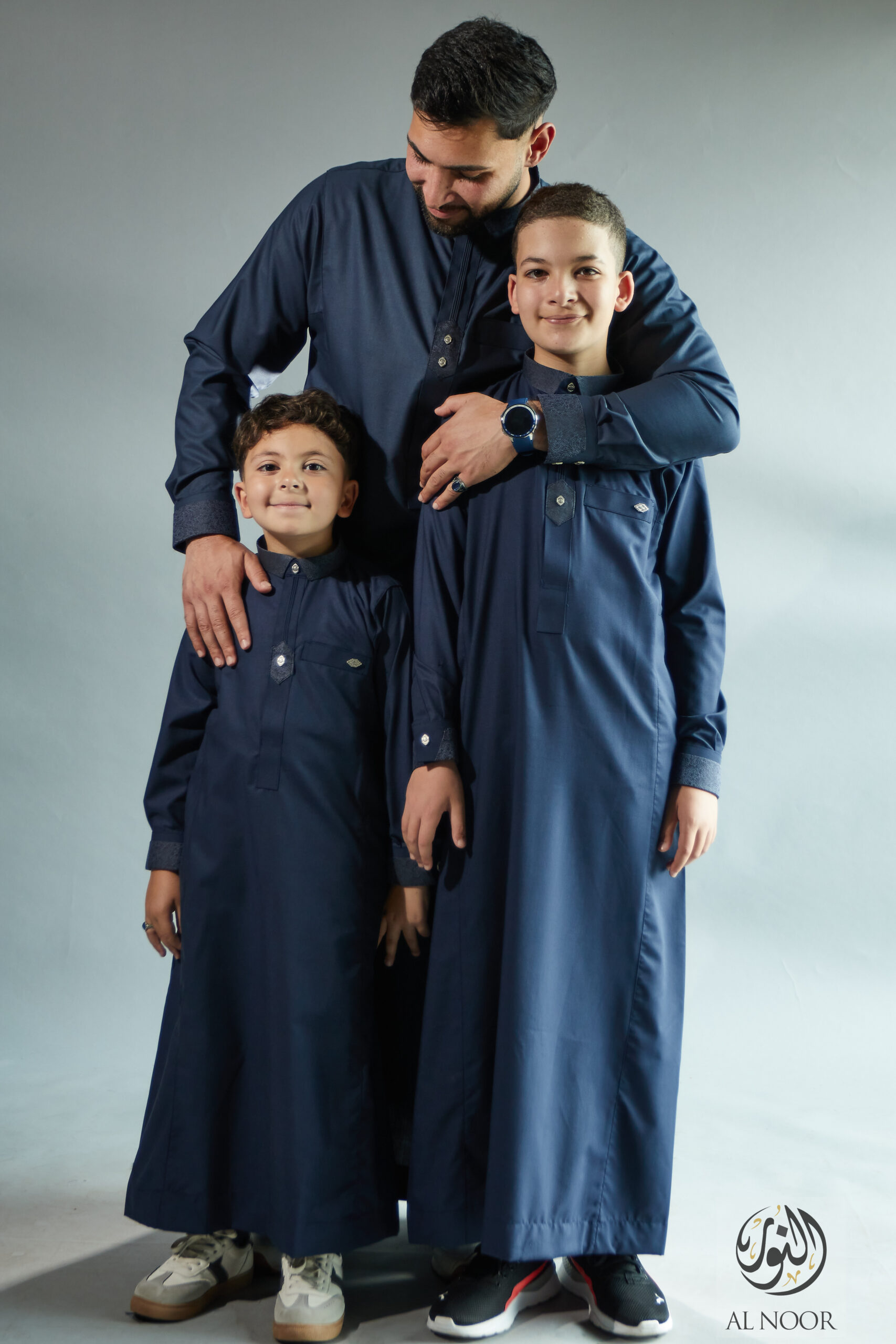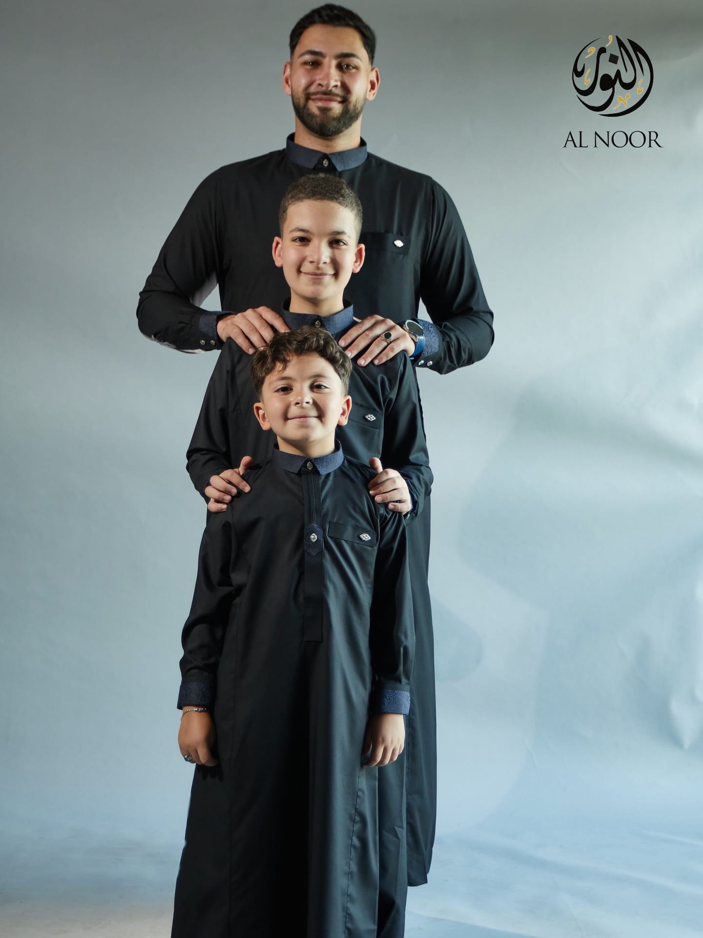 Al Noor matching Father & Son long sleeves thobe featuring an elegantly printed placket, cuff & top pocket with fancy metal signature buttons