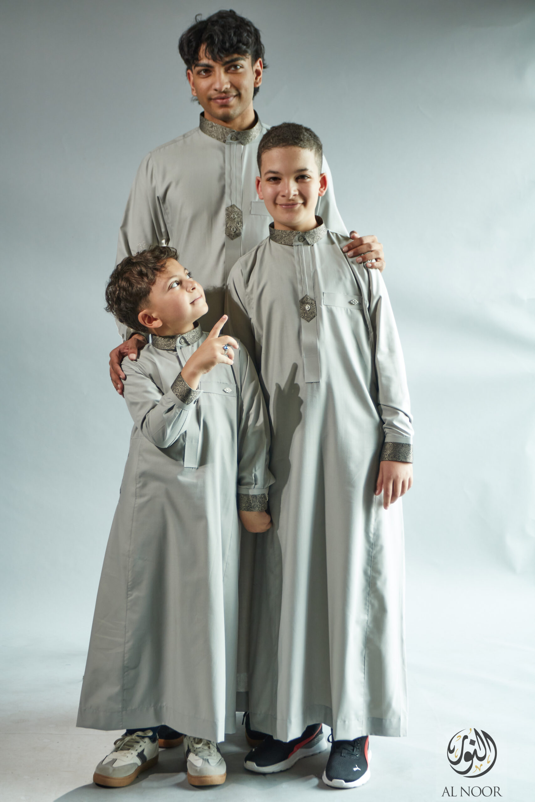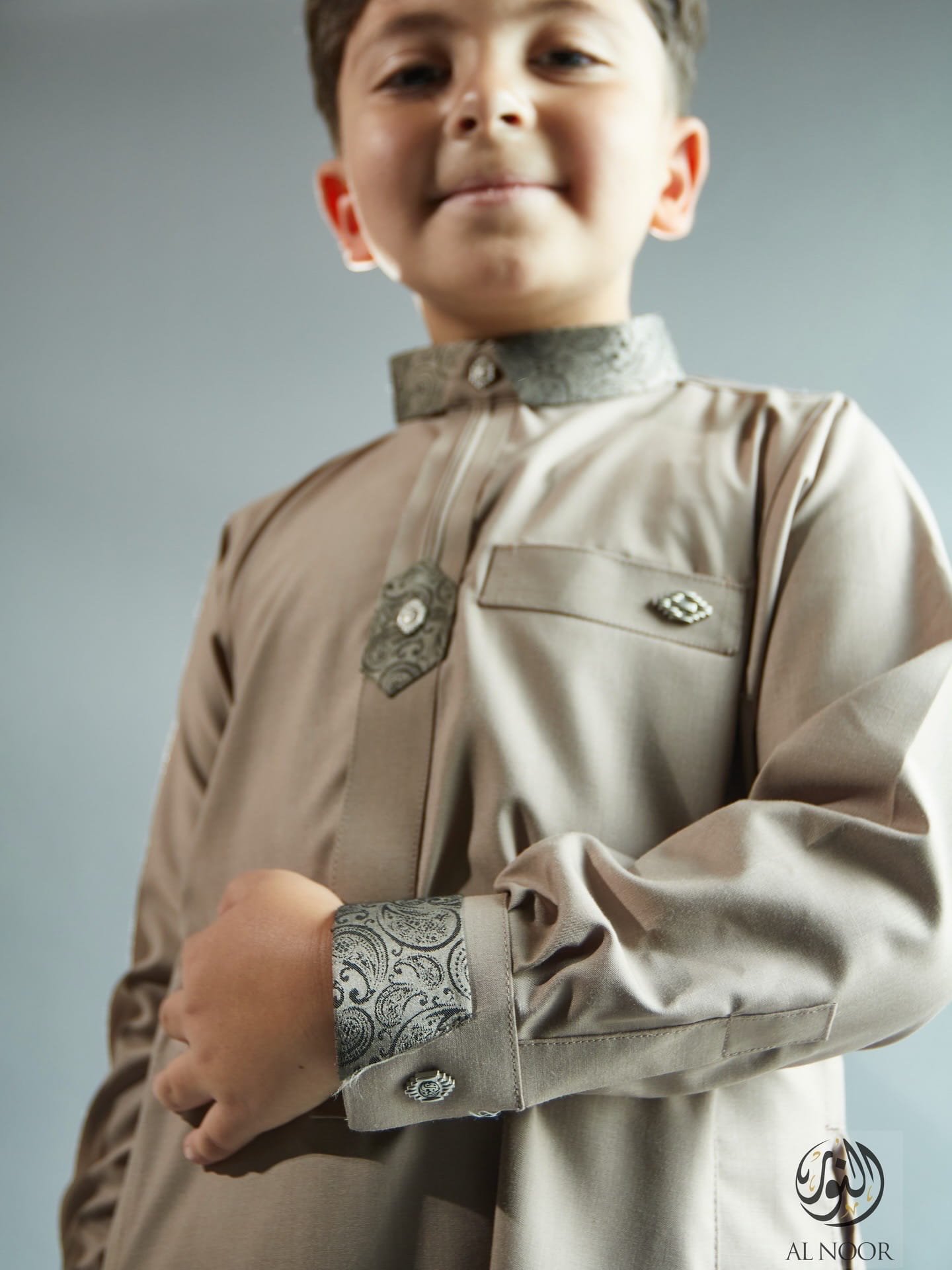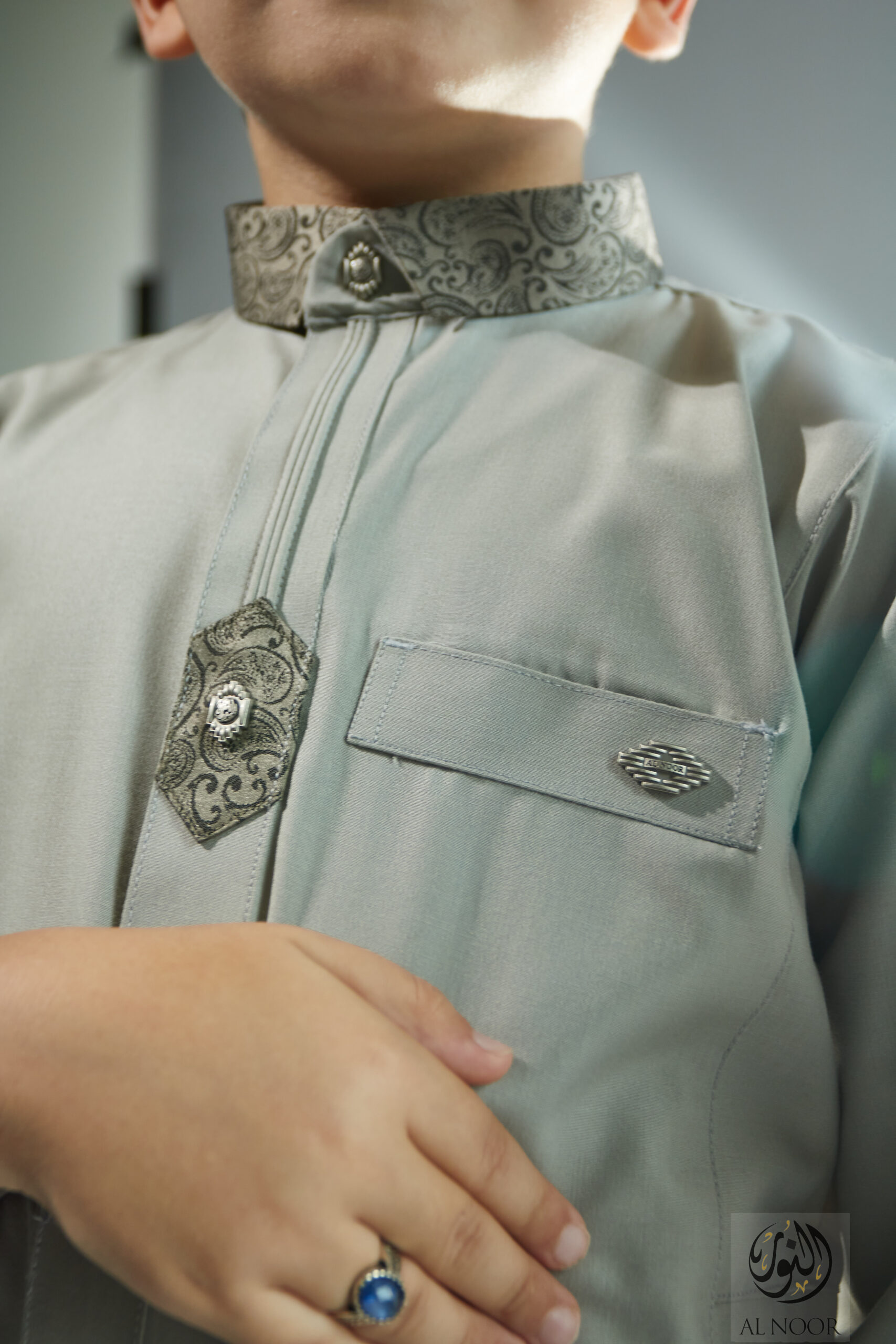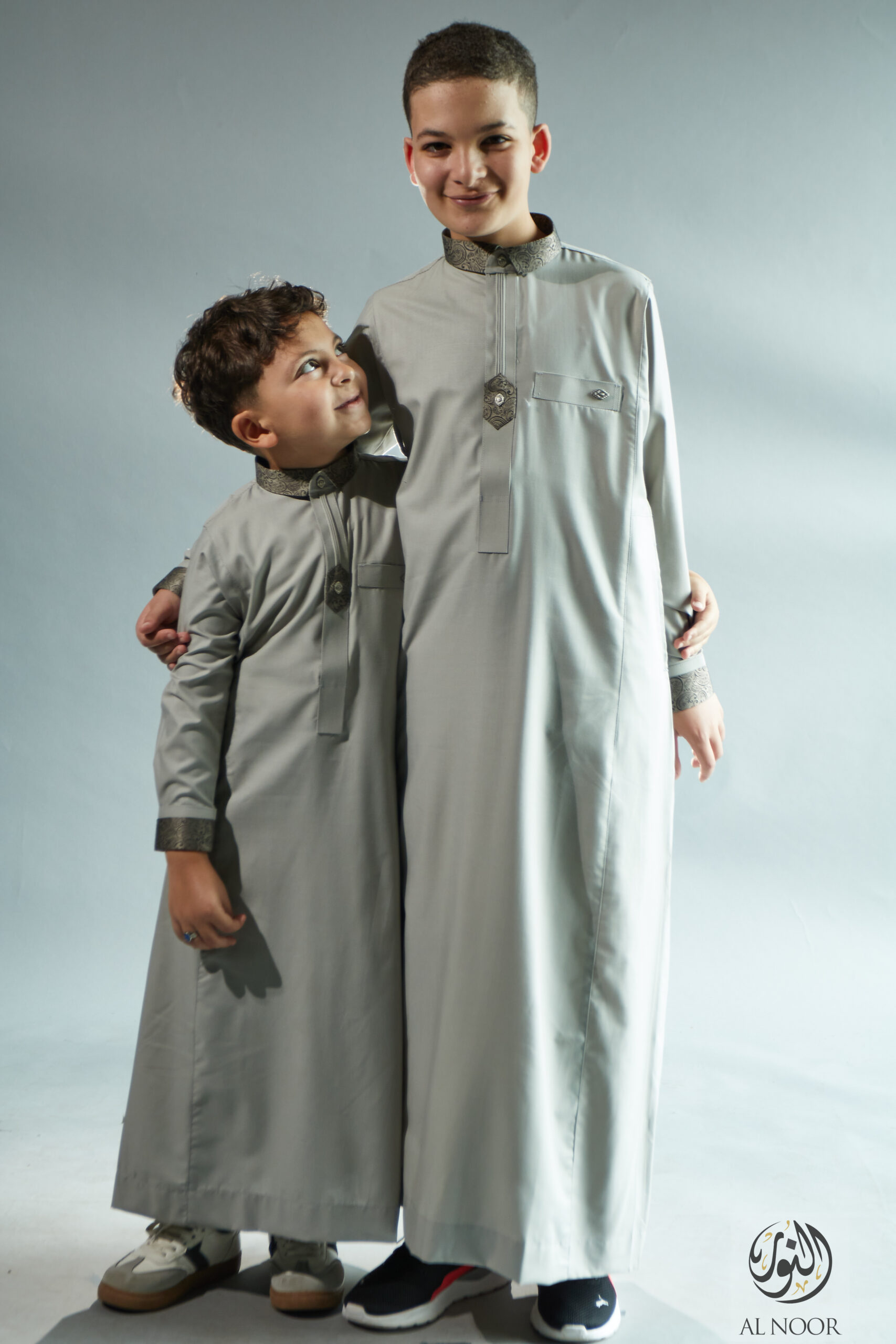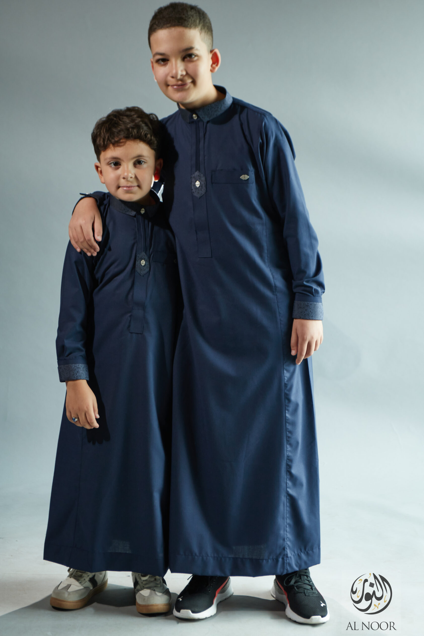 Al Noor matching Father & Son long sleeves thobe featuring an elegantly printed placket, cuff & top pocket with fancy metal signature buttons