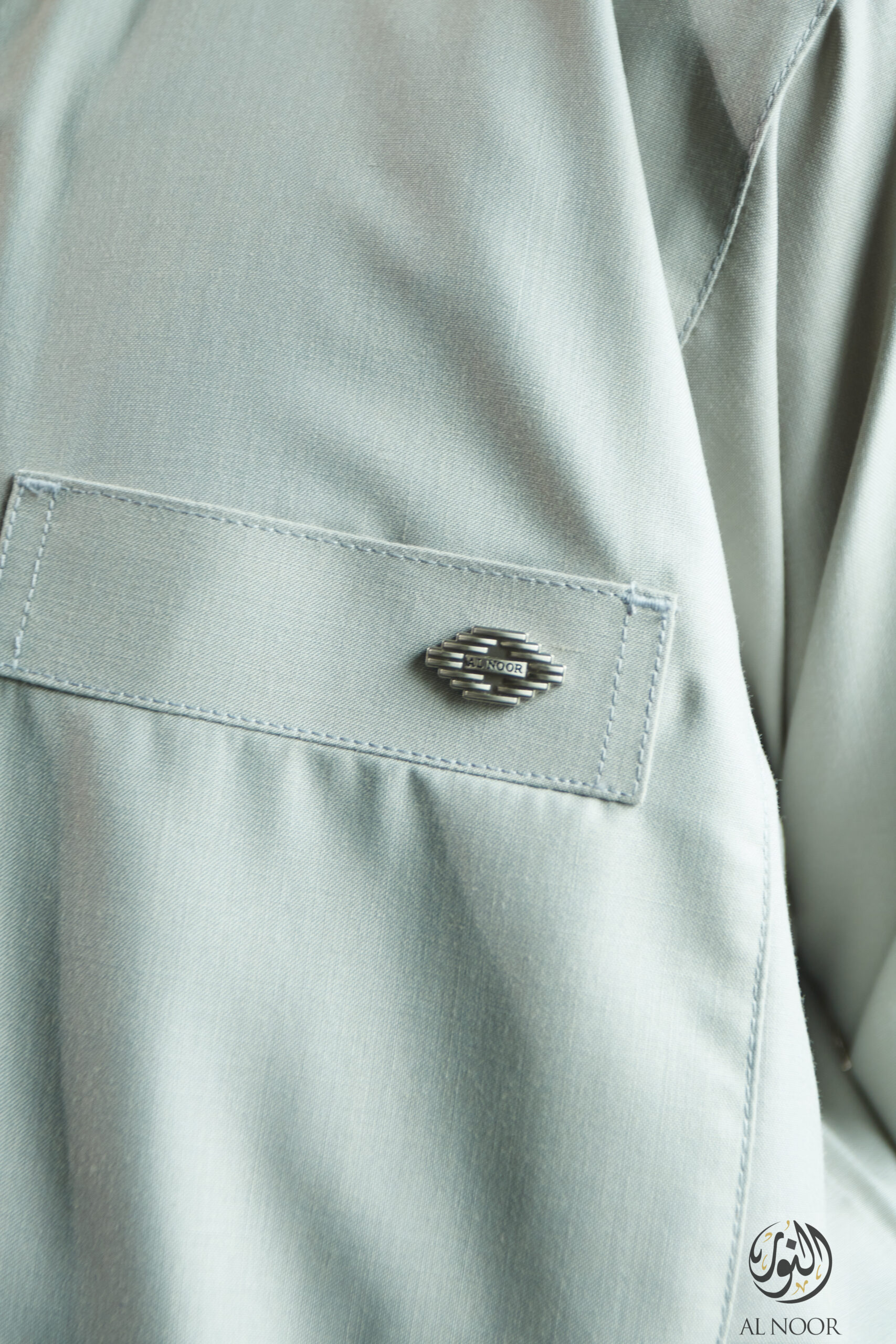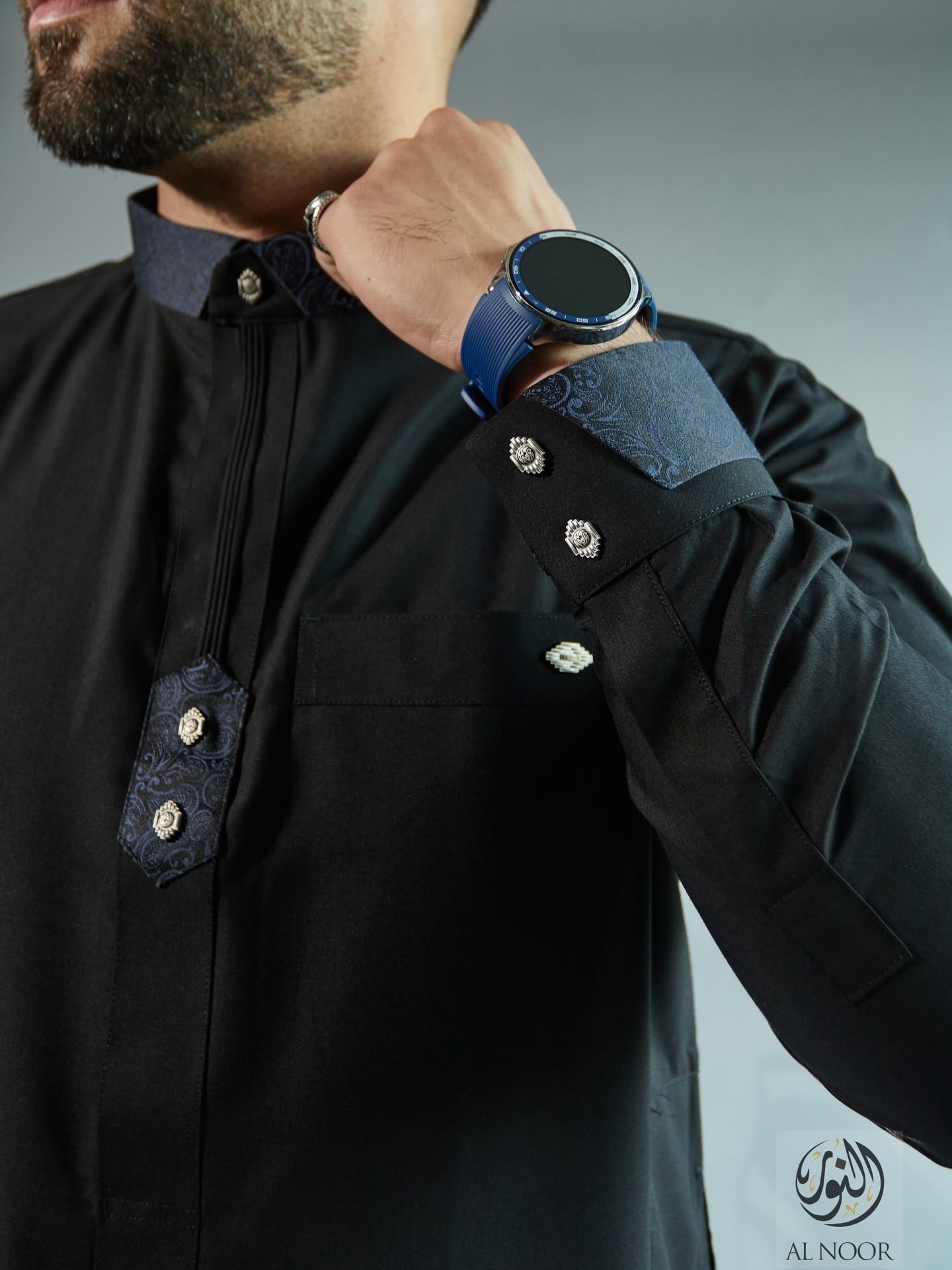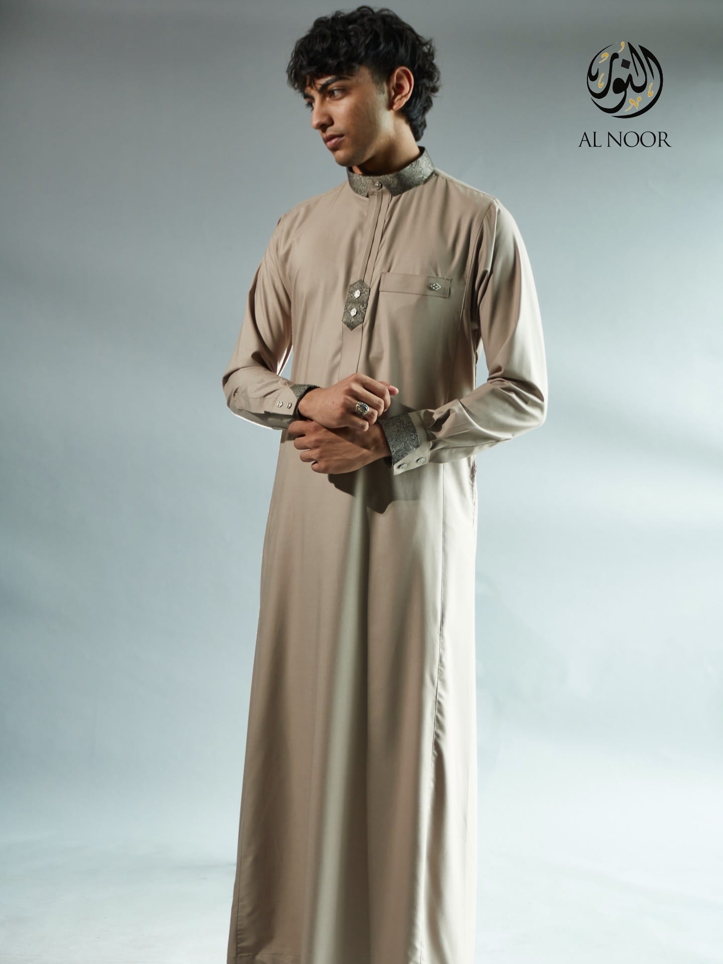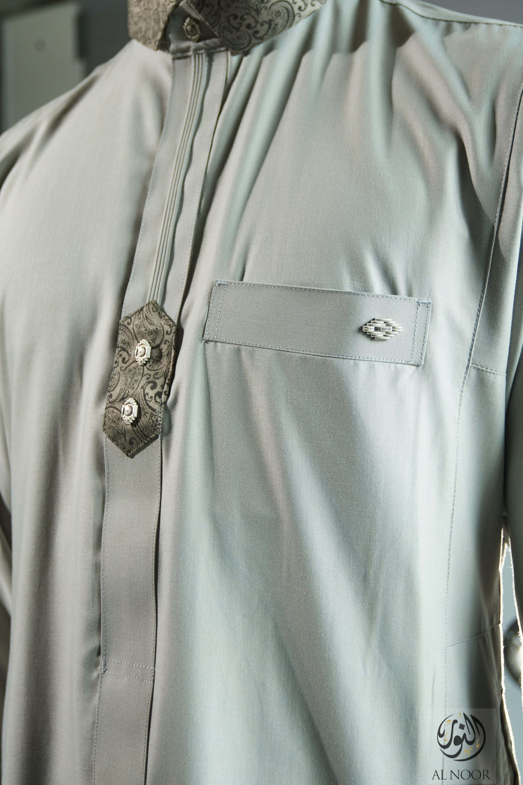 Al Noor matching Father & Son long sleeves thobe featuring an elegantly printed placket, cuff & top pocket with fancy metal signature buttons