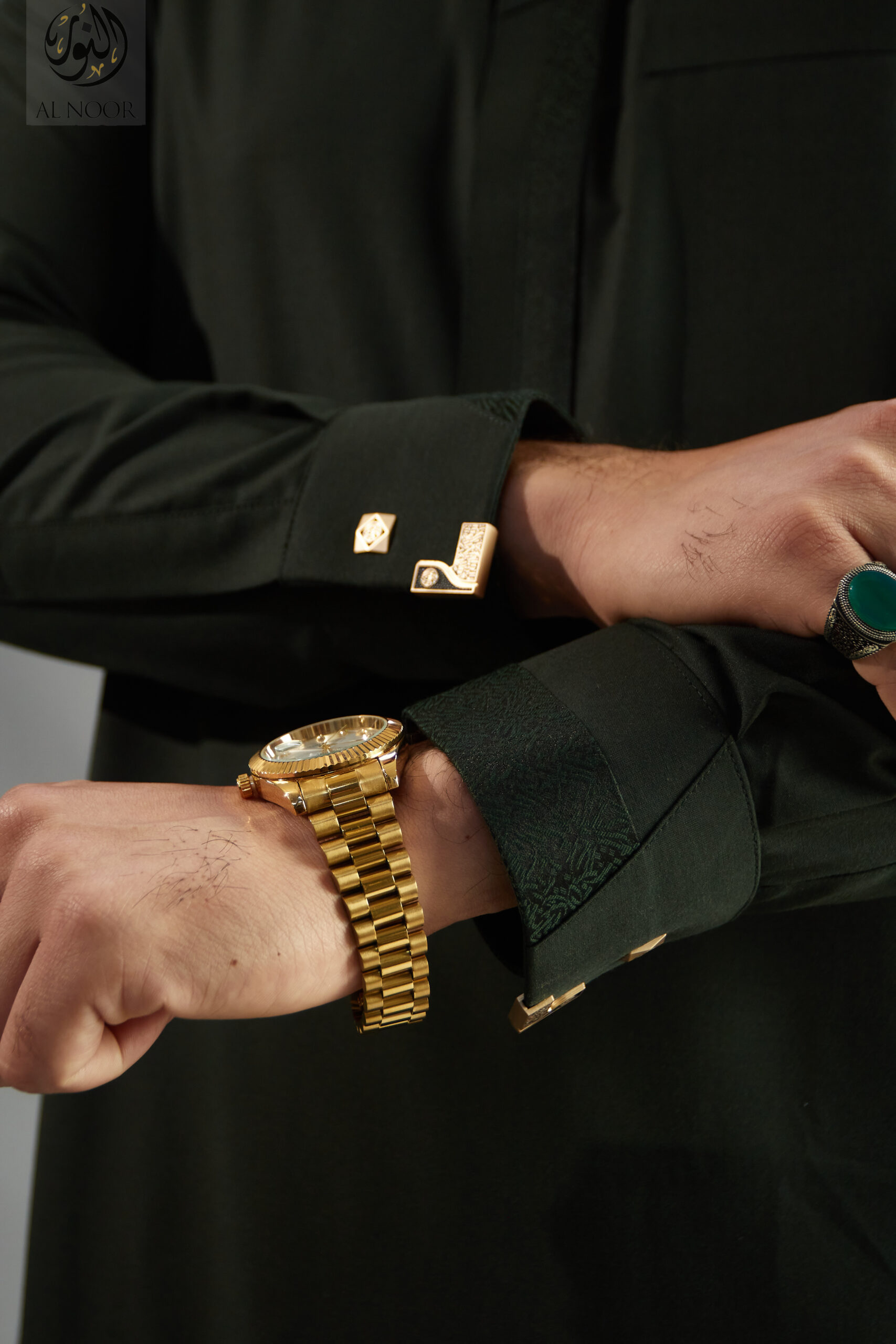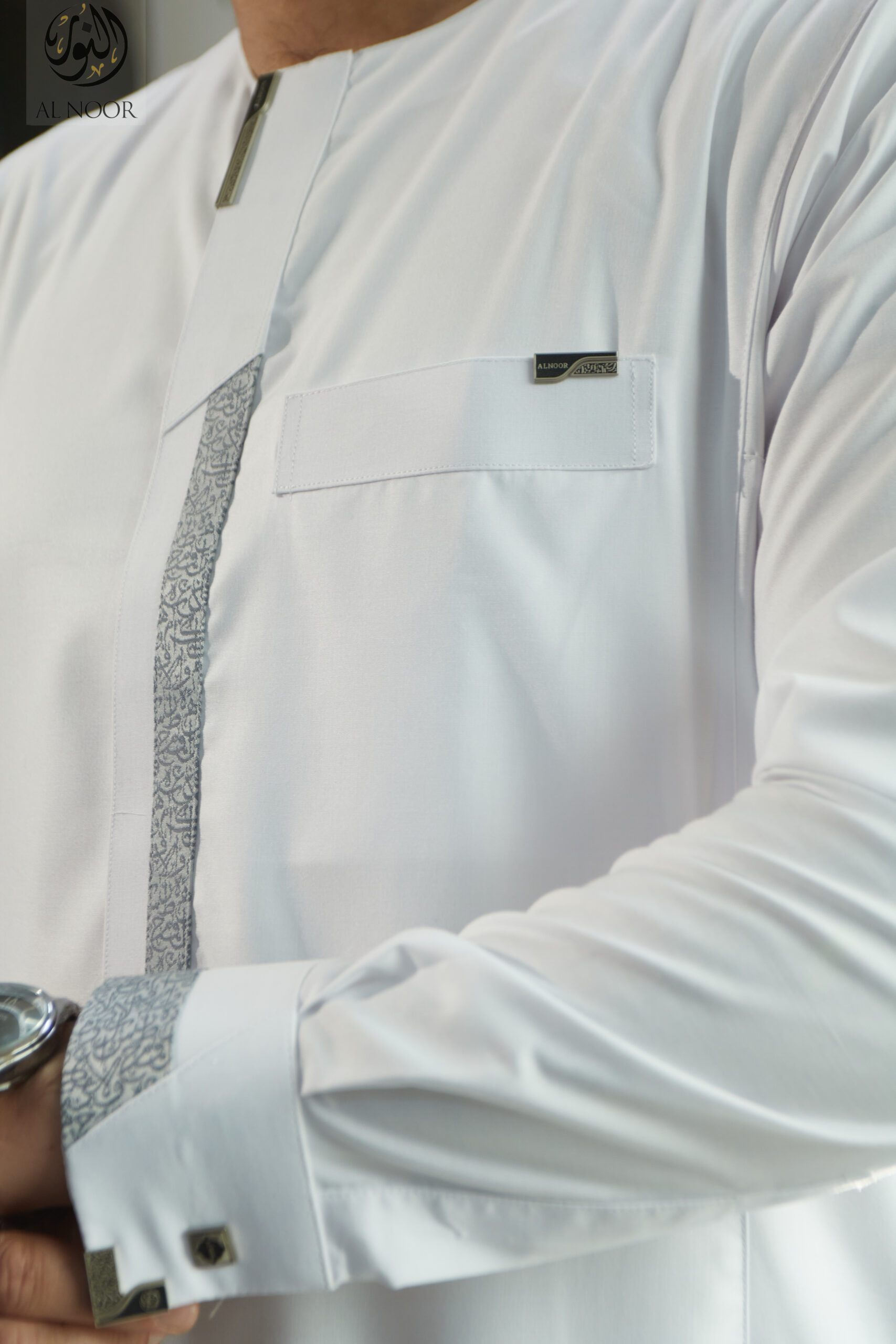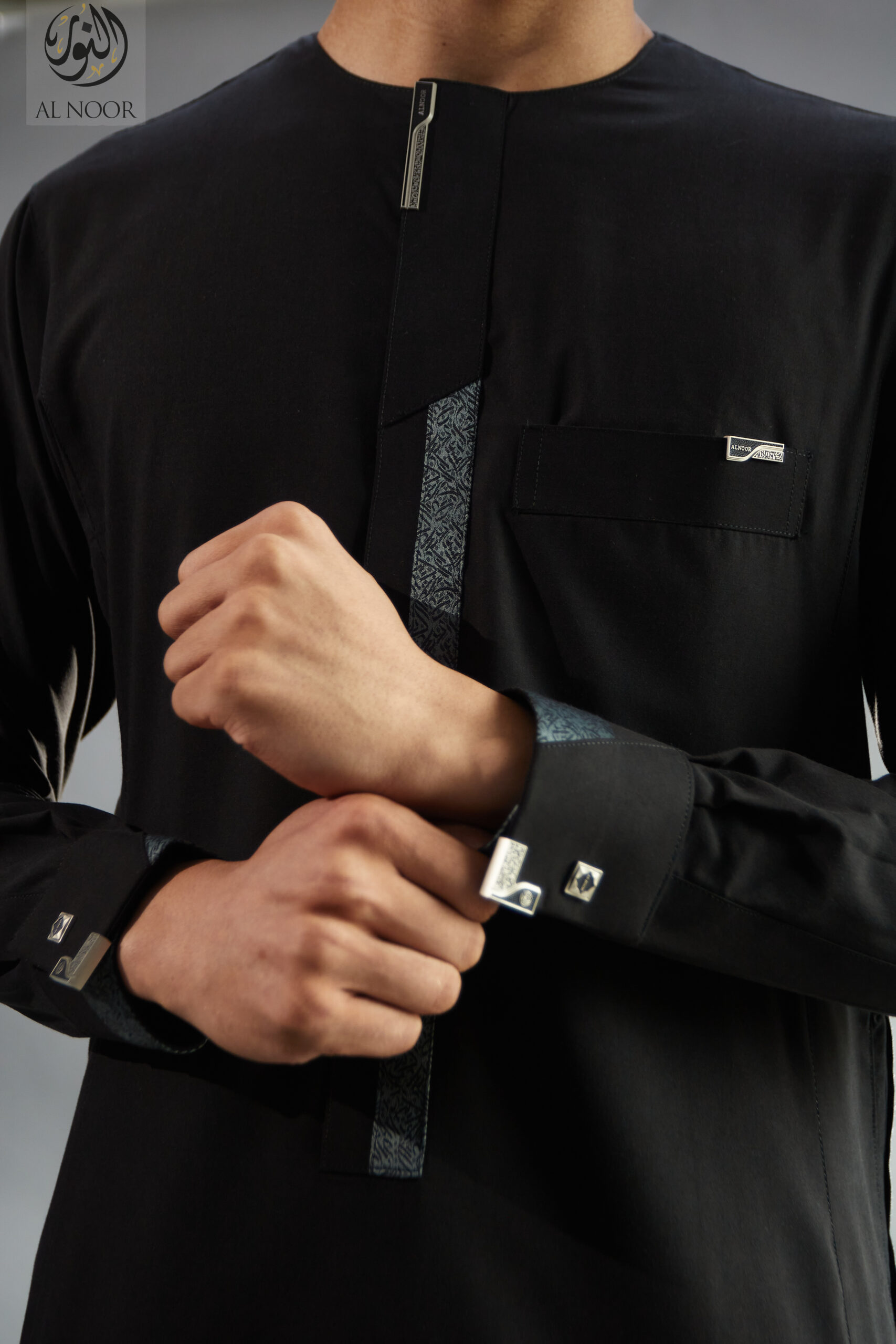 Calligraphy printed cuff & placket with hidden zip boasting an elegant metal tag & signature square metal buttons on cuffs
