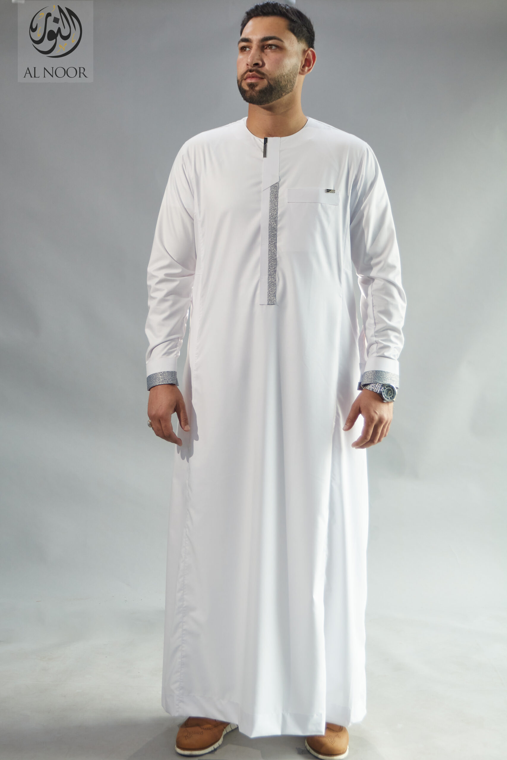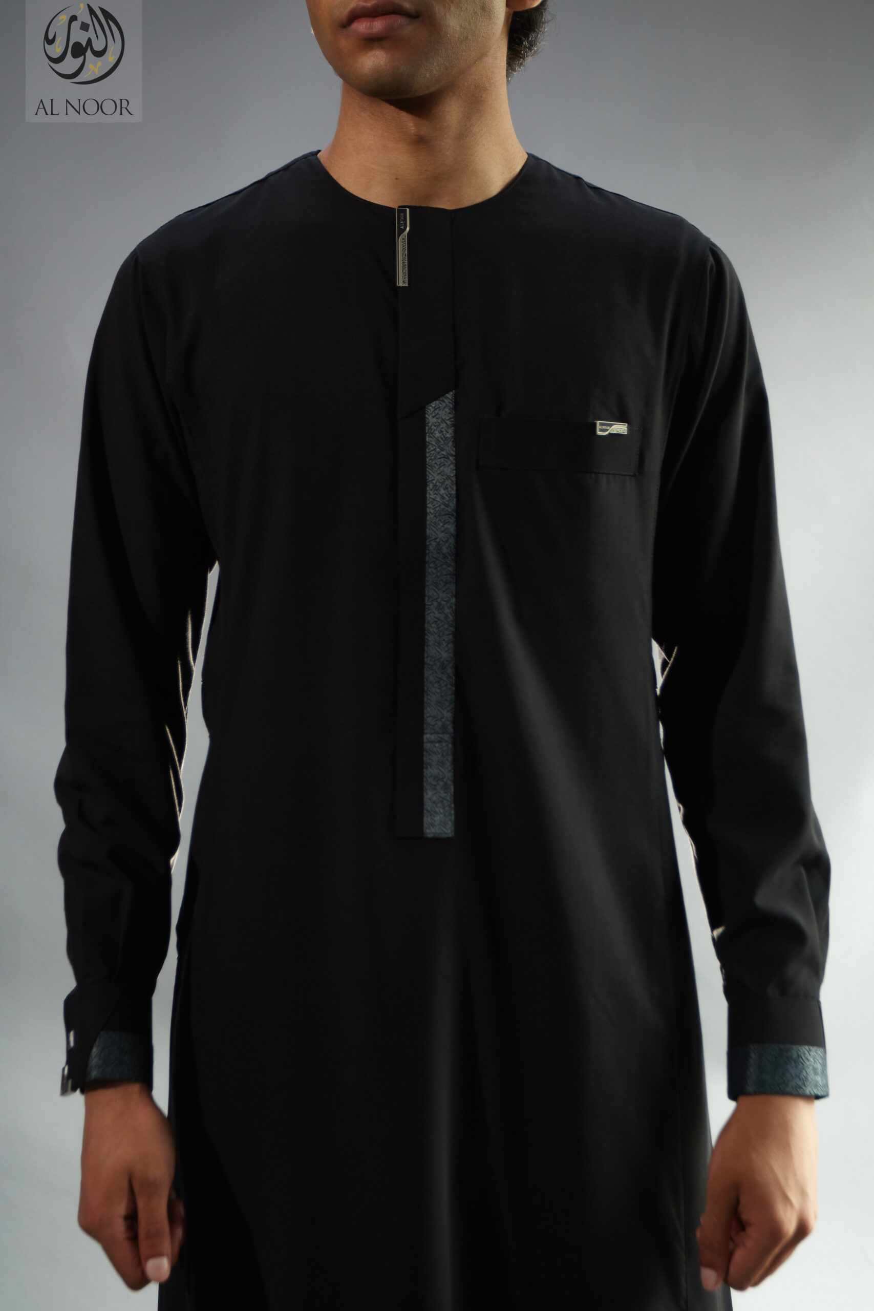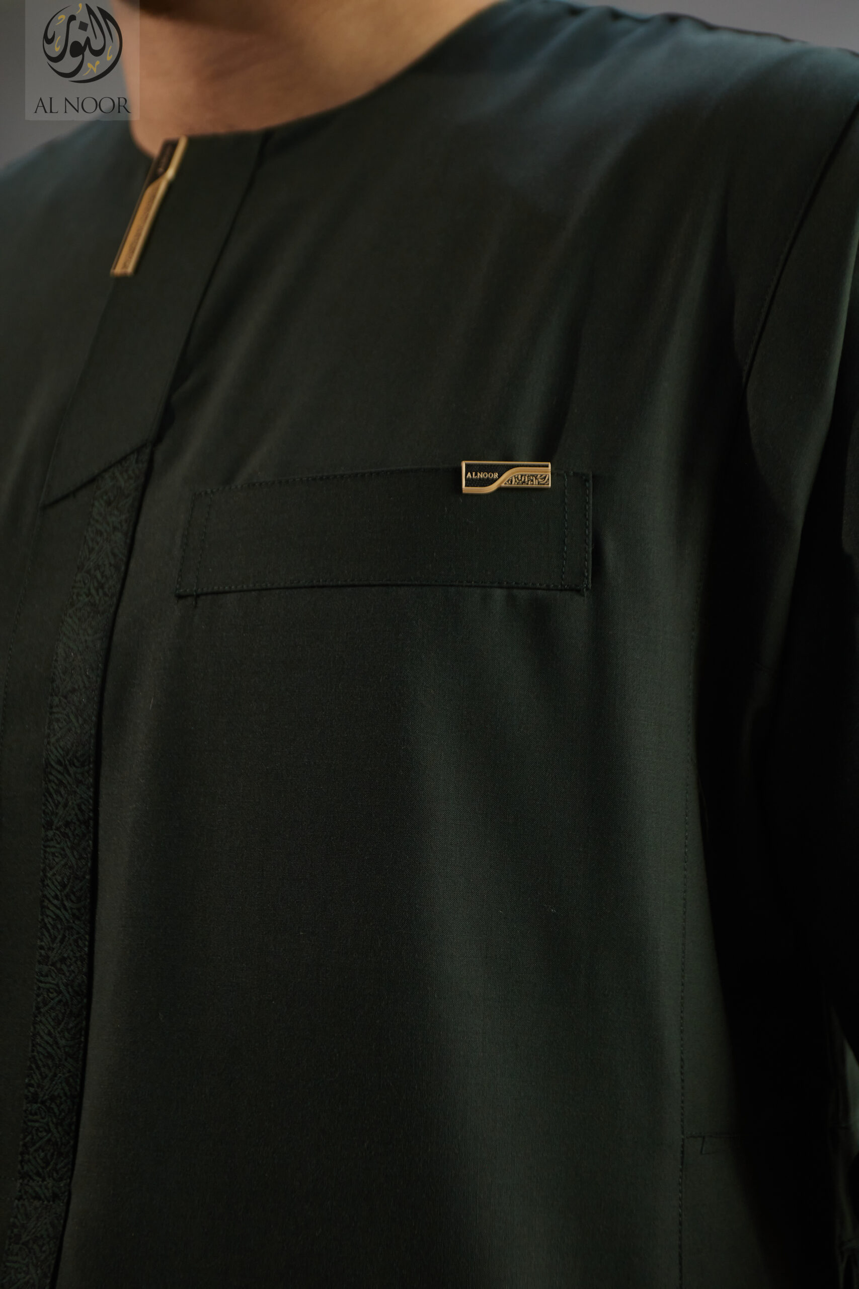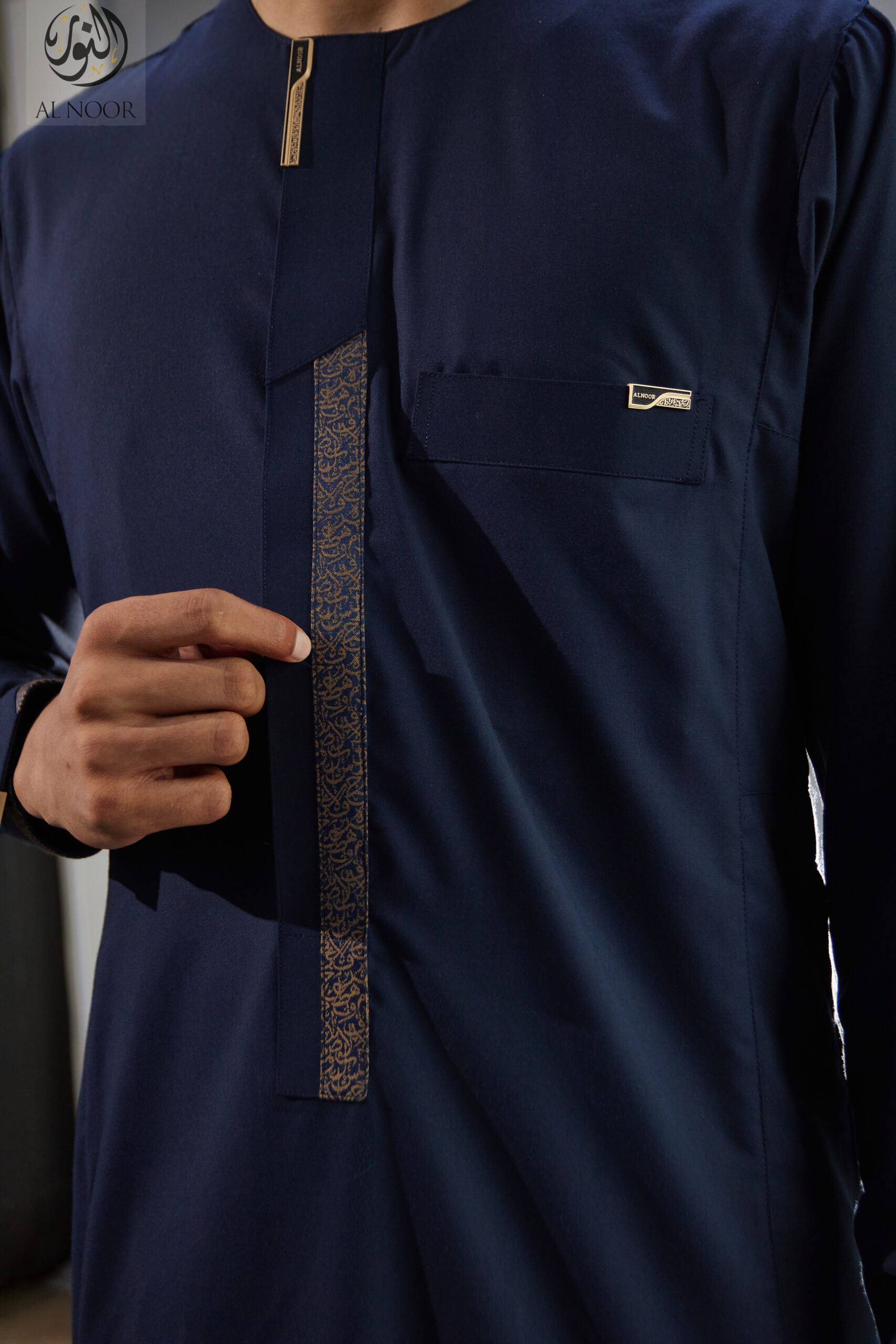 Calligraphy printed cuff & placket with hidden zip boasting an elegant metal tag & signature square metal buttons on cuffs